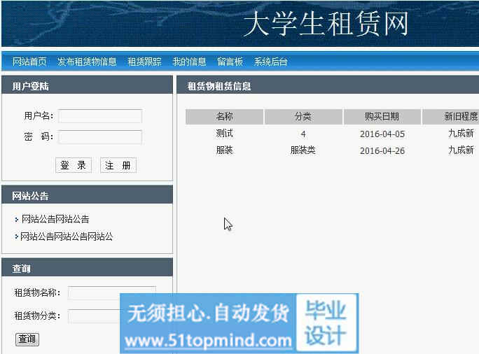 本系统前台主要java web 的jsp作为开发语言,后台使用msyql数据库,开发环境是MyEclipse,服务器采用tomcat,开发出的一个租赁物管理系统