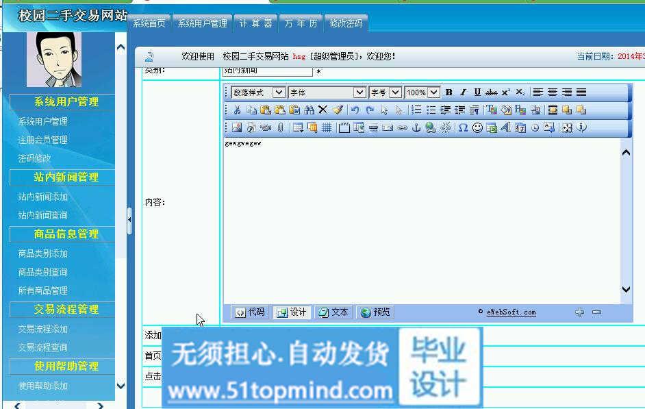 商品信息管理:该模块包括对商品类别信息的管理,二手商品信息的管理操作等,整体上管理了校园的二手商品信息。