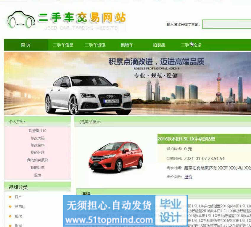 (3)首页:用户可以在个人中心修改密码、修改资料、在我的关注里可以查看关注的信息,还可以删除关注信息,在我的订单可以查看订单情况。在品牌分类可以查看车辆详细信息。在我的拍卖报价中可以查看拍卖结果。