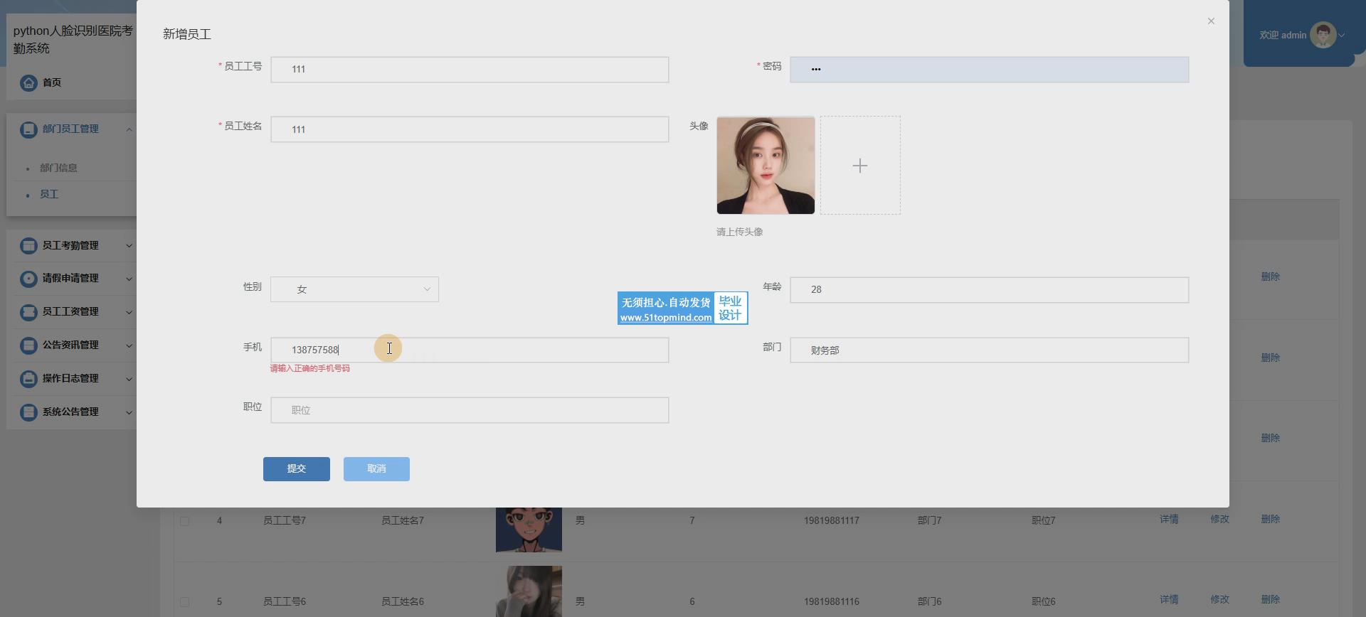员工利用此模块提交休假申请,选择休假种类,时间,系统人脸识别验证员工身份,处理请假请求,管理员审核批准,拒绝申请。