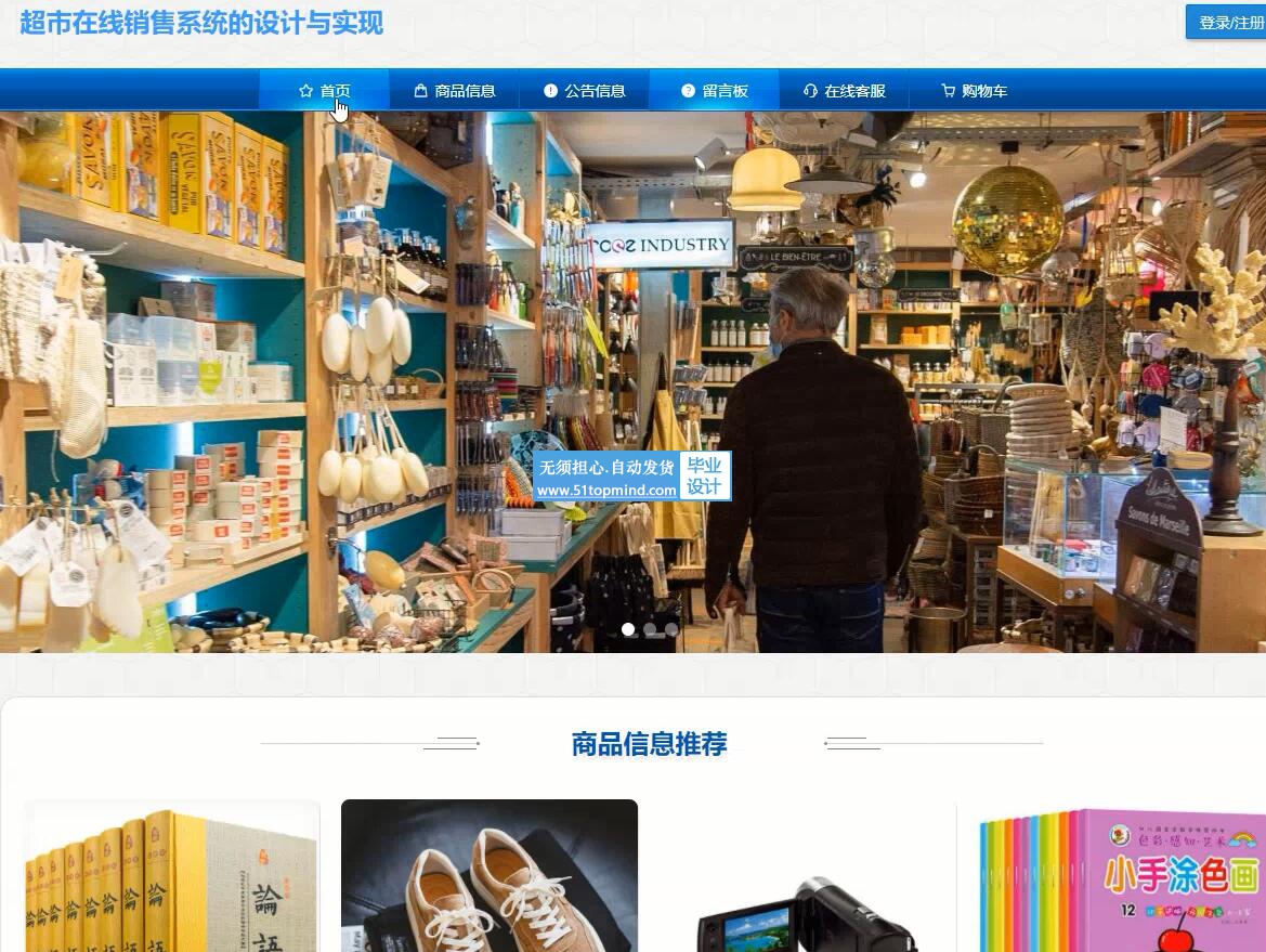(1) 系统主页展示商品信息、公告信息、留言板、在线客服、购物车等功能。