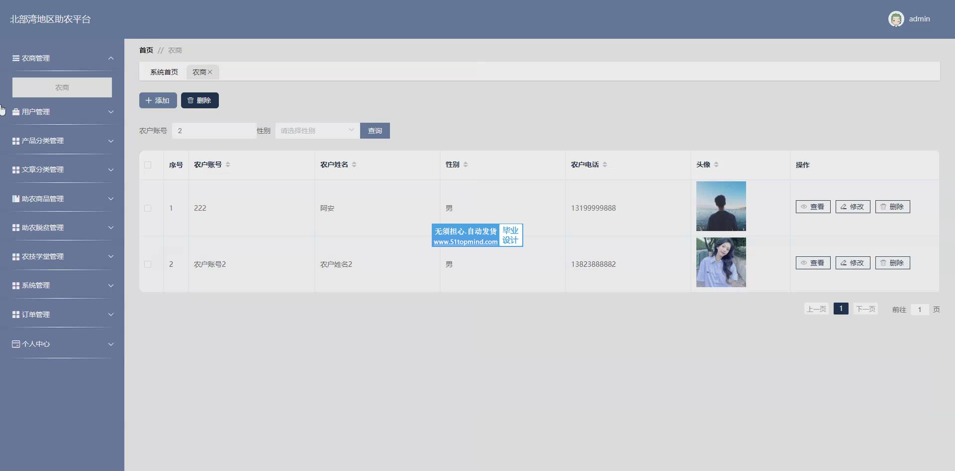 本系统分管理员、农商和用户三个角色,主要包括农商管理、用户管理、产品分类管理、文章分类管理、助农商品管理、助农脱贫管理、农技学堂管理、系统管理、订单管理、个人中心等功能。