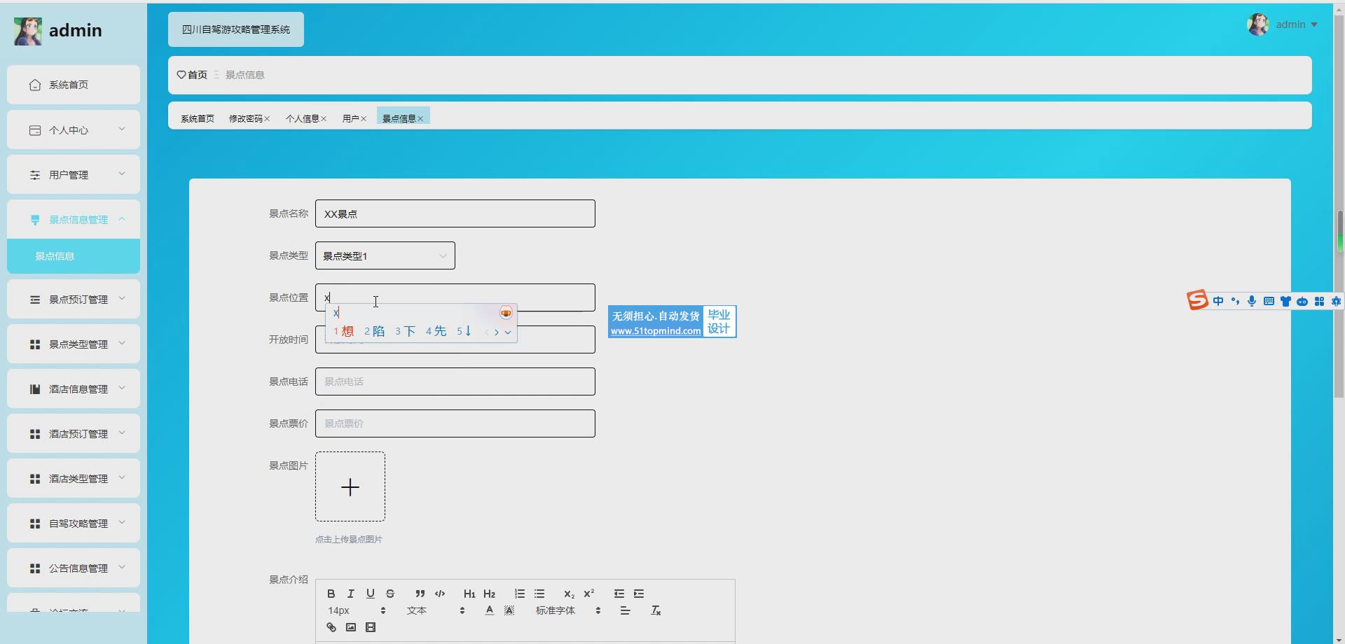 四川自驾游攻略管理系统是一款旨在为自驾游爱好者提供全面信息和便捷服务的在线平台。该系统包含了四川省内各主要旅游景点的用户管理、景点信息管理、景点预订管理、景点类型管理、酒店信息管理、酒店预订管理、酒店类型管理、自驾攻略管理、公告信息管理、论坛交流、系统管理等管理。四川自驾游攻略管理系统的目标是打造一个综合性的信息服务平台,让自驾游变得更加简单、安全和愉快。通过智能化的管理和服务,系统不仅极大地提升了用户体验,也为推动当地旅游经济的发展做出了贡献。