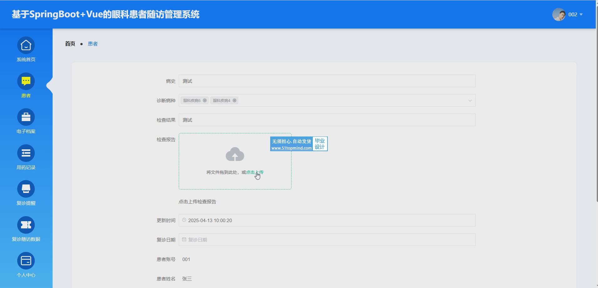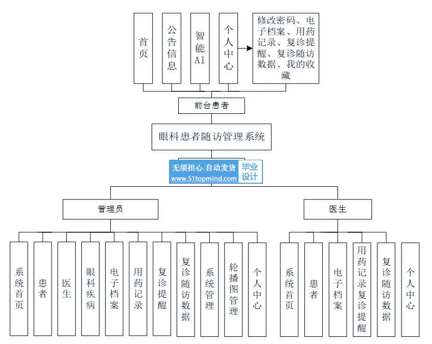 该系统由三大主体构成:管理员、患者及医生,各自扮演着不同的角色并拥有相应的权限。管理员作为系统的核心管理者,通过预设的多样化功能,能够全面掌控系统运作。利用专门的后台管理接口,对系统内的各类信息进行高效管理,确保系统的稳定运行。患者与医生则依据其特定权限,享受系统提供的不同功能服务。这种权限分级设计,不仅提升了系统的安全性和可控性,还使得各主体能够各司其职,共同促进系统的顺畅运作。该系统通过精细的权限划分,实现了对不同角色的有效管理和功能分配[9]。本文旨在设计一个既安全又便捷的系统,其核心理念围绕安全与简洁展开,目的是让患者能够更轻松地获取眼科患者随访管理的相关信息。通过这一设计,期望解决当前眼科患者随访管理信息繁杂难辨的问题,确保患者能够快速且准确地找到所需的电子档案、用药记录信息等。利用Java语言、Spring Boot框架以及MySQL数据库,开发设计了一个眼科患者随访管理系统。这一系统是基于对眼科患者随访管理业务流程的深入分析,并明确其功能性需求后构建的。该系统主要由三大部分组成:管理员端、患者和医生,以满足不同角色的使用需求。此外,该系统还能为患者提供一个便捷且实用的眼科患者随访管理系统,让患者能够迅速找到符合自身需求的物流信息。管理员通过专属界面能够高效地管理患者信息,并对系统内的所有信息进行增、删、改、查等操作。而对于患者而言,借助本系统,可以即时获取眼科的最新管理信息。