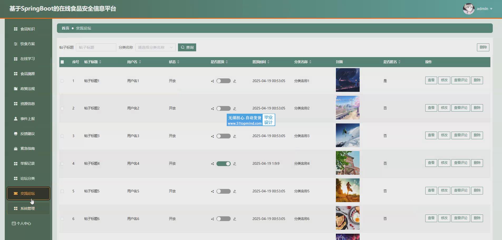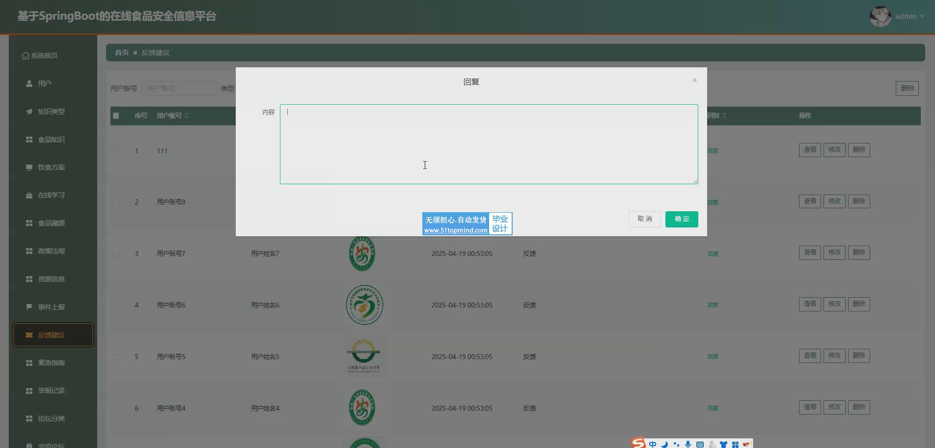 系统管理员拥有对多个核心功能模块给予综合管理的权力,如用户账户管理、食品知识库维护、个性化饮食方案制定、在线学习资源更新、食品全流程溯源监控、政策法规数据库完善、信息资源整合以及突发事件上报处理等全流程操作都覆盖在内,这些功能都可进行创建、修改、查询以及删除等基础数据操作本研究围绕食品安全信息管理领域里存在的数据安全隐患以及线下管理模式效率不高的问题展开分析,借助Spring Boot框架和MySQL数据库技术搭建了一套在线食品安全信息管理平台,这个平台可让终端用户随时查询各类食品安全相关信息,还可以为管理员给予食品知识库维护、膳食方案制定、在线教育模块、食品溯源追踪、政策法规更新、资源信息整合以及应急指南发布等管理功能。该系统的应用提升了信息管理效率,优化了资源配置,为构建可持续发展的食品安全信息化平台打下了技术基础。