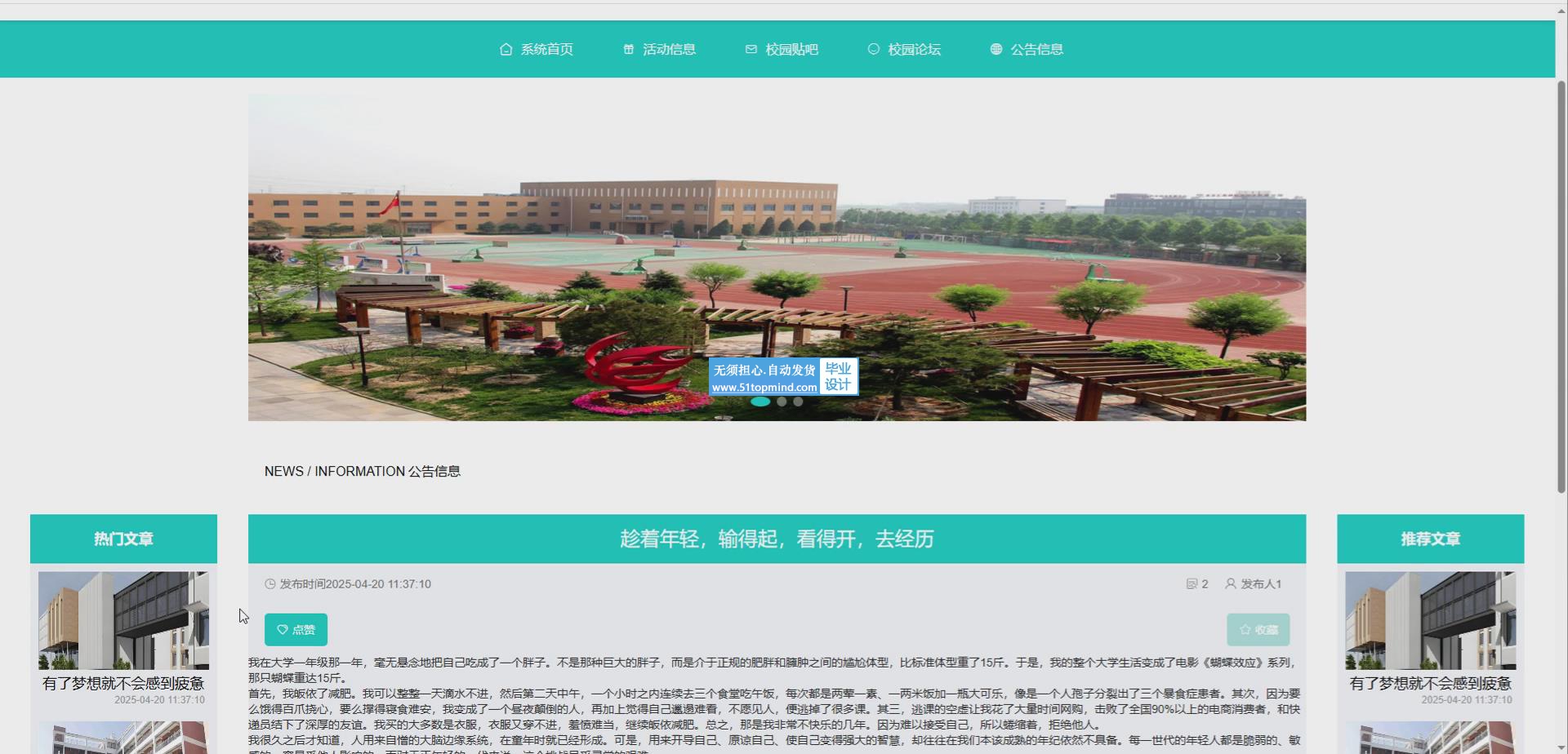 当下,在信息技术得以快速发展之际,校园信息化建设在持续地向前推进,而校园论坛,作为一个重要的交流平台,其作用正日益变得凸显起来。不过,传统的校园论坛存在着诸多的问题,像采用用户名和密码的登录方式,这其中安全隐患是很大的,密码容易被破解或者被窃取,进而致使账号被盗用以及信息被泄露;还缺乏有效的实名认证机制,由此使得虚假信息泛滥成灾,对校园网络秩序形成了干扰。与此同时,校园活动的组织管理也陷入了困境之中,人工去处理活动的报名、签到,其效率是低下的,容易出现错误,并且存在着冒名顶替的现象。为了推动校园信息化建设,旨在打造一个安全、高效、易用的校园论坛平台的系统设计,以通过人脸识别和实名认证的方式来提升系统的安全性,借由实现自动化的活动管理流程以提高管理效率,凭借提供友好的用户界面以及丰富的功能,进而满足师生的交流和信息获取需求。