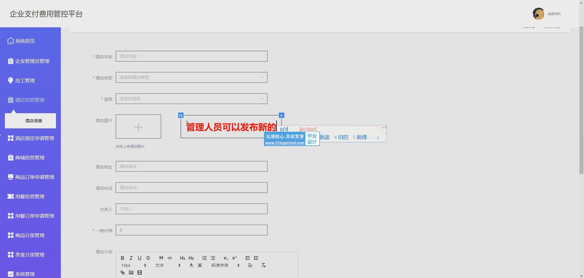 5.酒店预定页面,展示酒店信息,企业管理员能预定、退订酒店,系统管理员能新增,删除,修改酒店信息,员工申请申请单够才能预定、退订酒店,预定、退订时需在申请单申请的消费规则内,若价格超出或公司不支持退订则弹出警告,不能预定或退订,若企业账户余额不足则不能购买