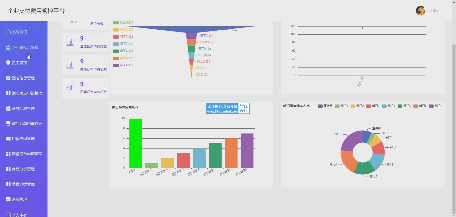 9.本年总体消费页面,企业管理员可查看所有员工本年总体消费跟各个消费占比(酒店、点餐、商城)