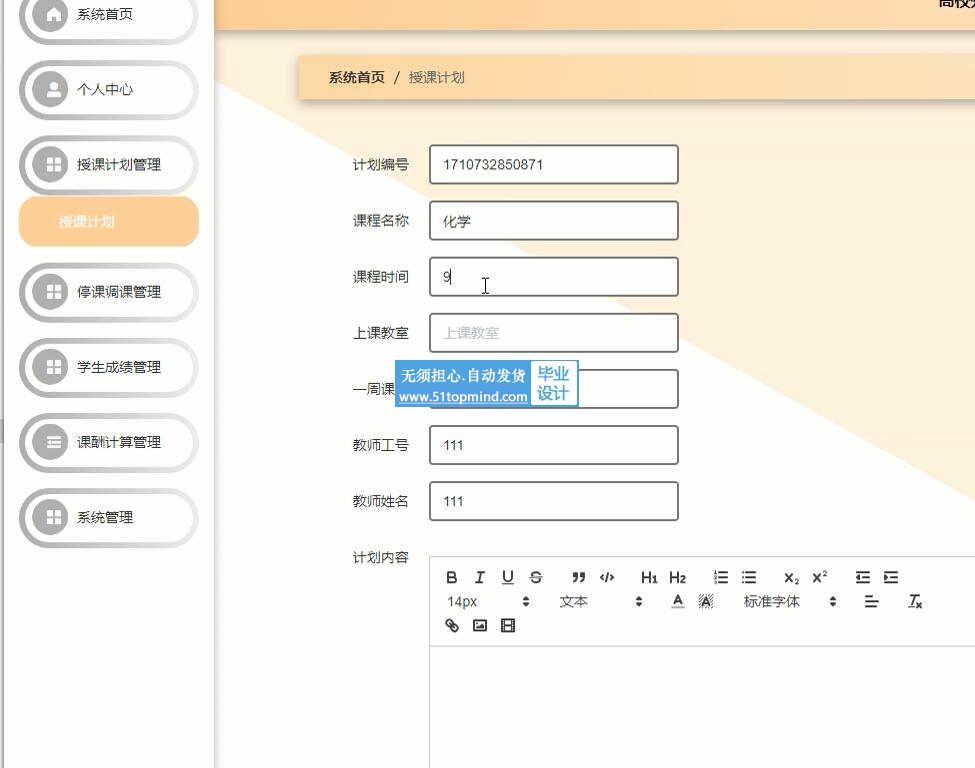 (3)管理员通过后台系统来完成对所有信息的编辑,包括添加、删除等操作。本系统解决了高校外聘教师信息管理事务中的主要问题,能够实现对外聘教师信息的高效管理,减少繁琐的纸质流程,提高学校对外聘教师管理的科学性和效率,有助于推动教育管理工作。系统主要包括以下多个功能模块:个人中心、外聘教师管理、授课计划管理、停课调课管理、学生成绩管理、课酬计算管理、系统管理等。