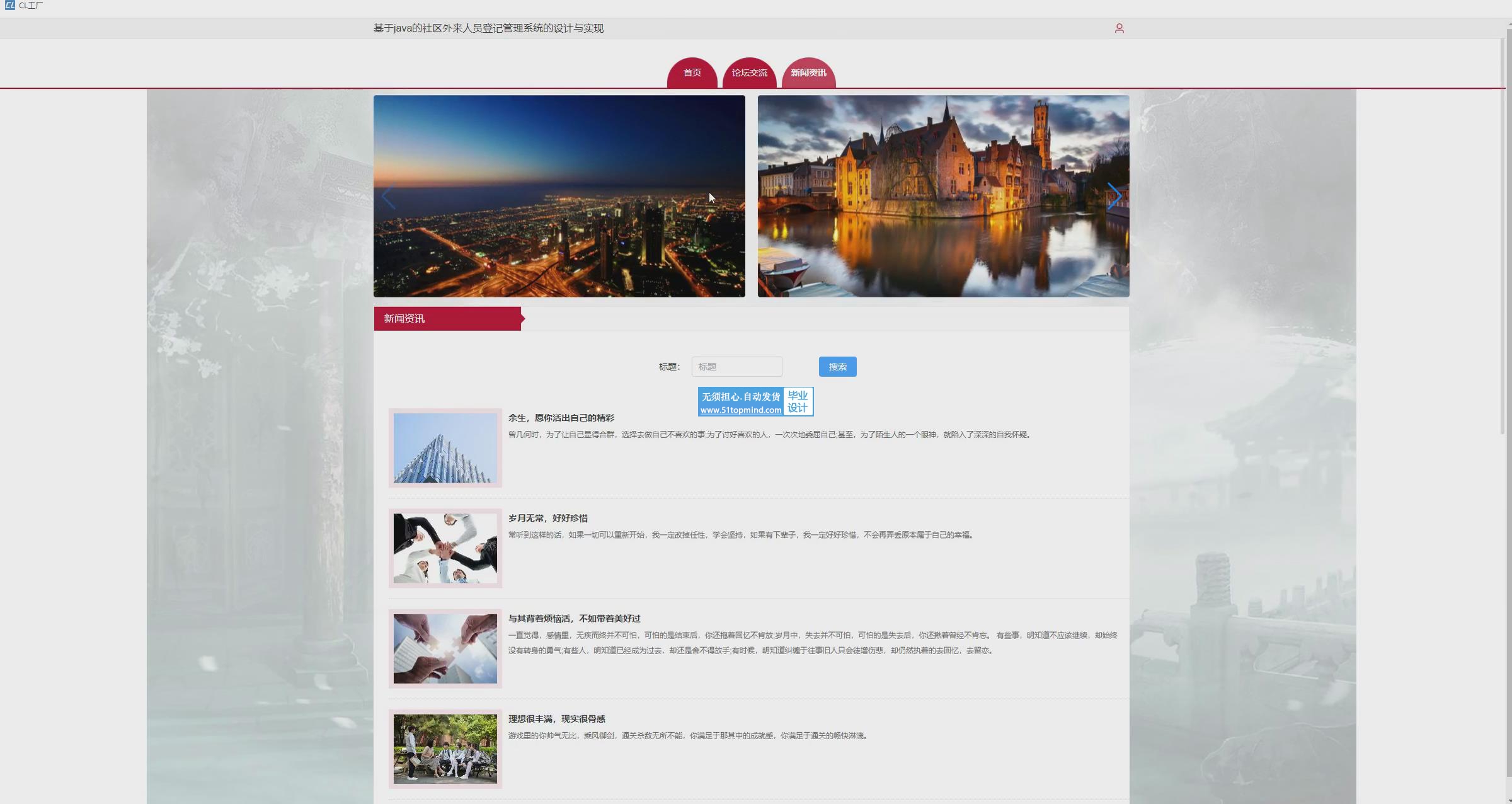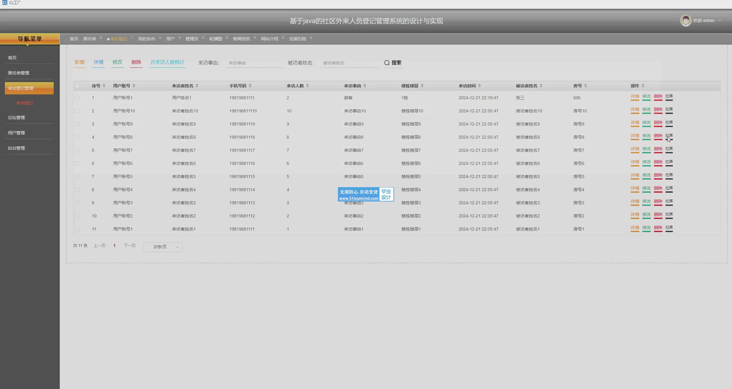 社区外来人员登记管理系统的设计内容包含前端开发、后端开发和数据库设计,使用Vue.js作为前端框架,Spring Boot作为后端框架,MySQL作为数据库管理系统。后端开发部分中Spring负责管理对象的生命周期,提供依赖注入和事务管理等功能。SpringMVC负责处理前端请求,将请求转发到相应的处理方法,并返回结果给前端。MyBatis则负责数据库操作,通过映射文件实现SQL与Java对象之间的映射关系。社区外来人员登记管理系统的功能模块包括用户管理、来访管理、黑名单管理、新闻资讯管理、论坛管理等功能。这些模块覆盖了社区外来人员登记信息的采集、编辑、发布、管理和搜索等方面,为用户提供了一个便捷、高效的社区外来人员登记管理平台。