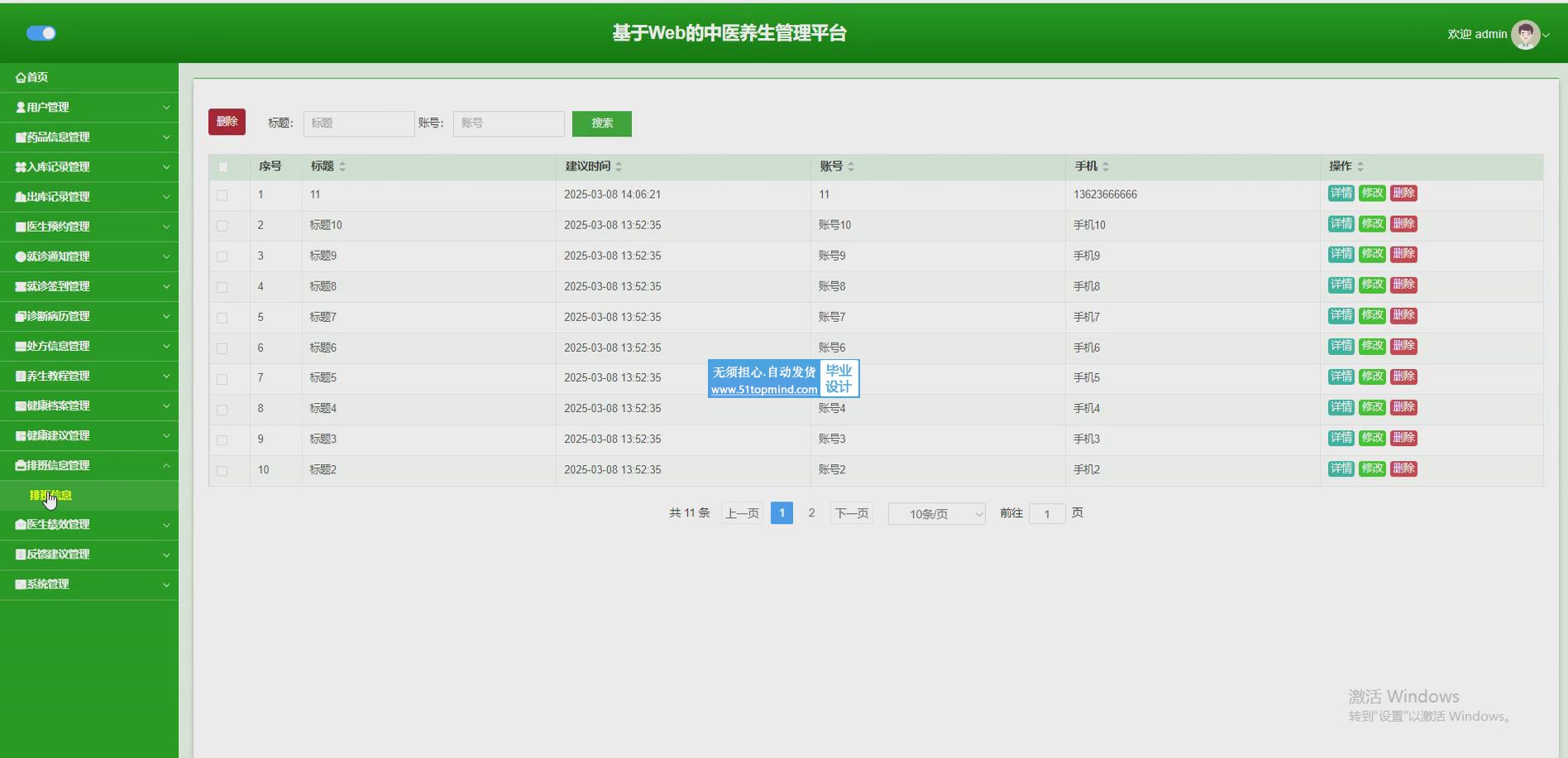 养生教程管理:发布和维护中医养生相关的文章、视频等内容。