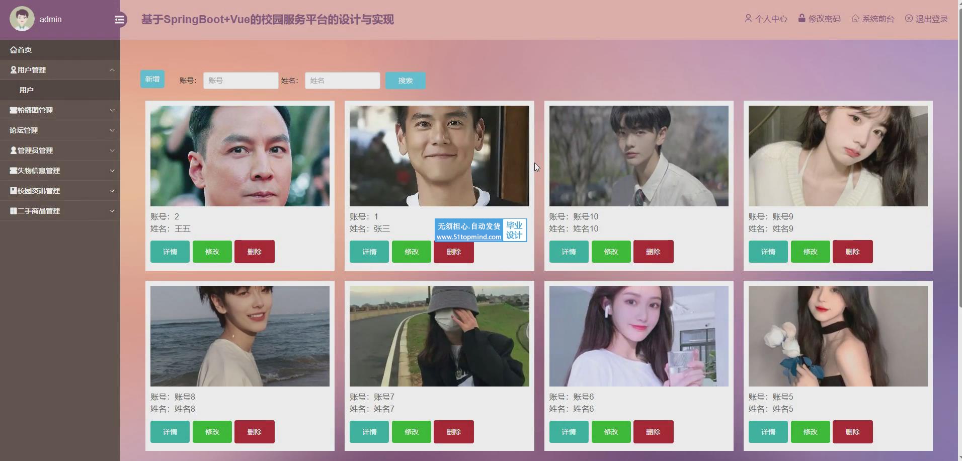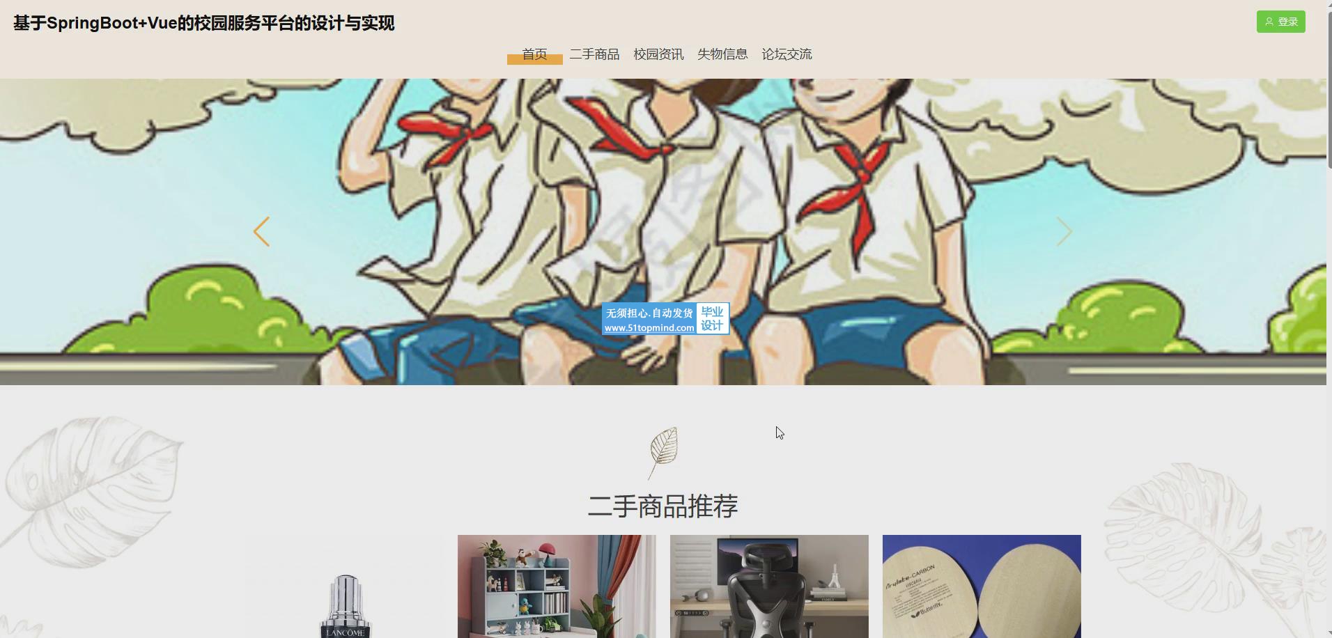 本研究基于SpringBoot和Vue框架,采用前后端分离架构,结合MySQL数据库,开发了一个多功能的校园综合服务平台。系统主要包含六大核心模块:校园资讯发布、闲置物品交易、交流社区、失物招领、个人中心及后台管理。通过角色权限控制,实现了系统管理员与普通用户的分级管理:管理员负责内容审核、用户管理和系统维护;注册用户可进行信息浏览、商品交易、发帖互动等操作。系统采用RESTfulAPI接口实现前后端数据交互。测试结果表明,该系统运行稳定,响应迅速,界面友好,各项功能均达到设计要求。该平台的实施有效整合了校园服务资源,提高了信息共享效率,为师生提供了便捷的一站式校园服务体验,对推进智慧校园建设具有积极的实践意义。