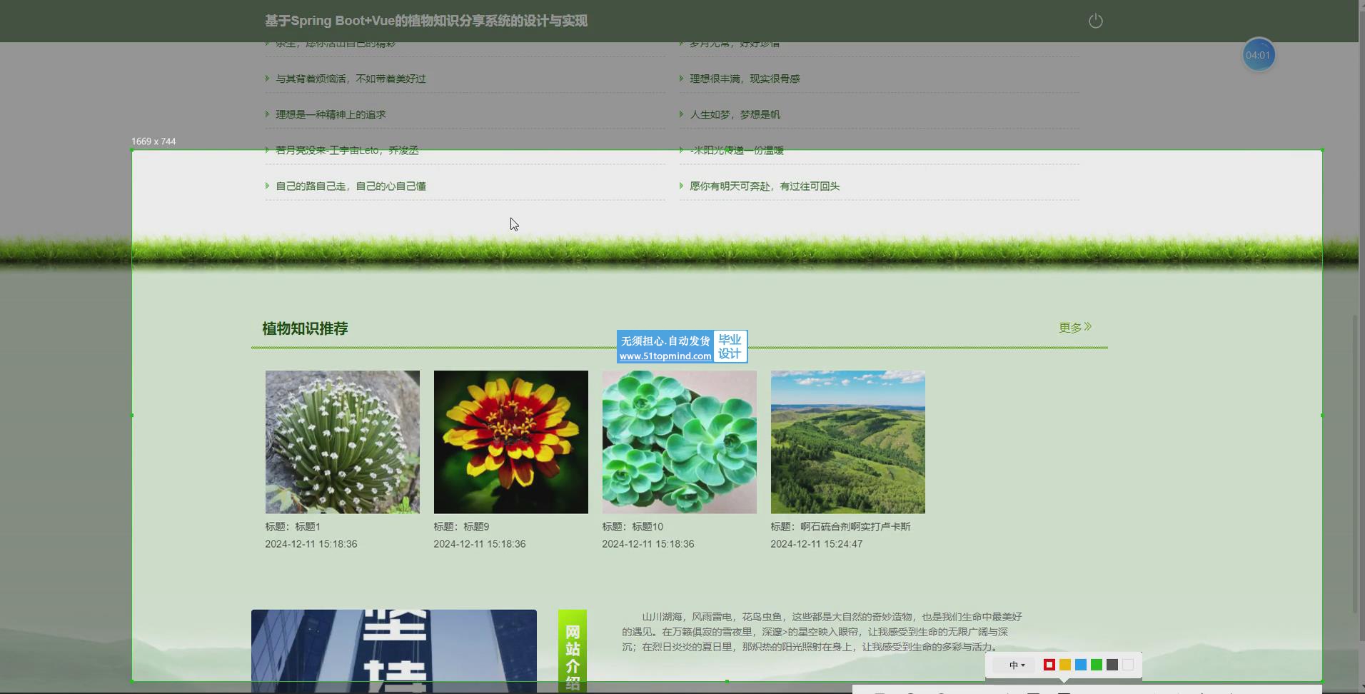 针对这一现状,本课题在深入调研植物知识分享现状并对比现有系统的基础上,设计并开发了一套基于Spring Boot+Vue的植物知识分享系统。本系统以MyEclipse为集成开发环境,选用MySQL作为数据库管理系统,Web服务器则采用Tomcat。在架构设计上,系统遵循MVC(Model-View-Controller)思想,并借助Spring Boot框架和Vue前端技术,实现了前后端分离的高效开发模式。为了充分利用网络信息化的优势,本系统采用了B/S结构,使得用户无需安装额外软件,仅需通过浏览器即可访问和使用。系统功能丰富,包括植物知识发布、搜索、分享、评论以及新闻资讯推送等,全面满足了用户对植物知识获取和分享的需求。在数据管理方面,本系统实现了植物知识信息的在线录入、实时更新和高效维护,所有信息均通过数据库进行传递和处理,无需纸质方式操作,大大提高了工作效率。同时,系统还具备强大的数据安全和隐私保护功能,确保用户信息的安全性和隐私性。