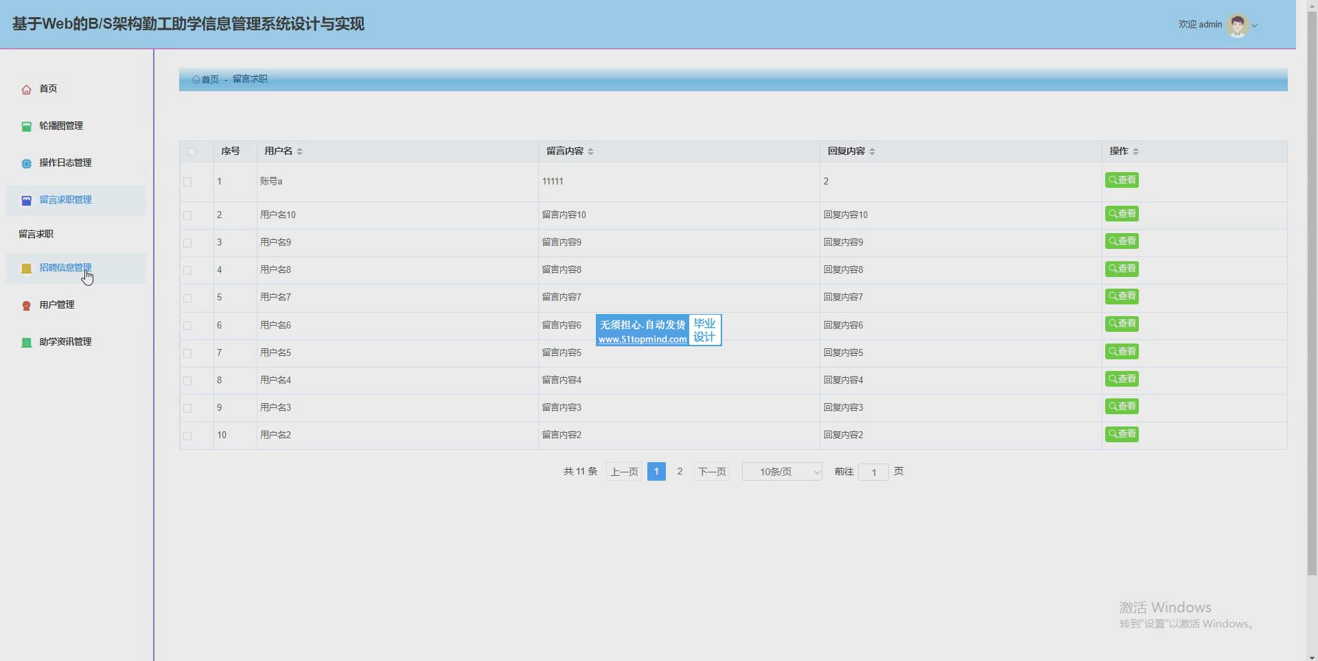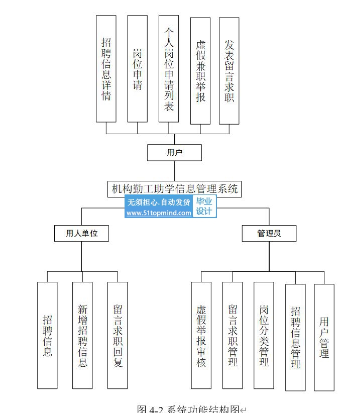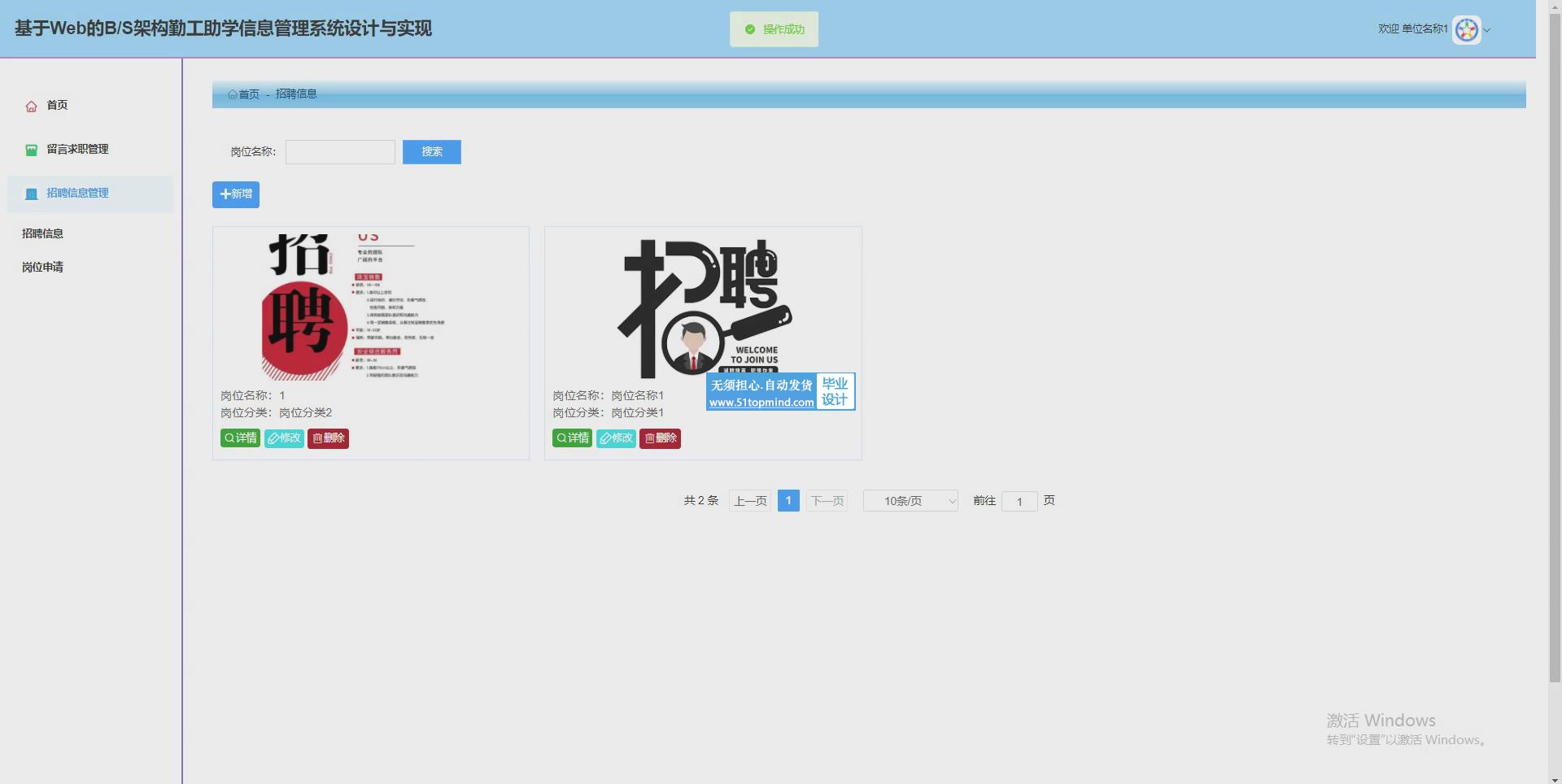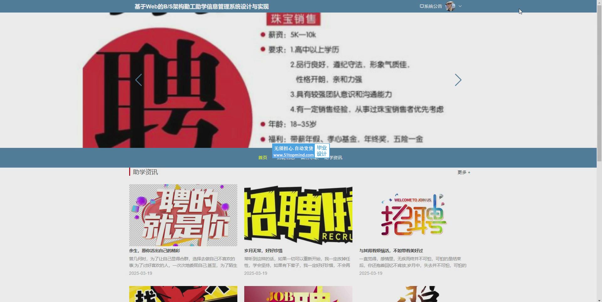 随着互联网技术发展,机构勤工助学信息管理方式亟待变革。传统模式下,信息传递依赖线下宣传与纸质登记,流程繁琐、效率低下,信息更新不及时,易出现岗位信息滞后、求职者与用人单位对接不畅等问题。为解决这些问题,构建基于SpringBoot的机构勤工助学信息管理系统。系统前端采用Vue技术,后端基于SpringBoot框架,数据库选用MySQL。系统功能涵盖用户端招聘信息详情查看、岗位申请、个人岗位申请列表查询、虚假兼职举报及留言求职发表;用人单位端可发布招聘信息、新增招聘信息及回复留言求职;管理员端负责虚假举报审核、留言求职管理、岗位分类管理、招聘信息管理及用户管理。