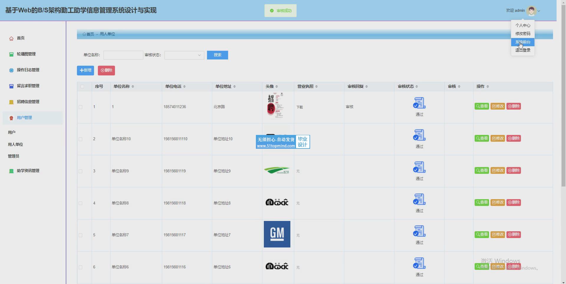 本研究主要聚焦于基于Web的BS机构勤工助学信息管理系统的开发与设计。研究内容涵盖系统需求分析、功能设计与实现,以及系统测试与优化。通过深入调研机构勤工助学活动的业务流程和用户需求,明确系统功能模块,包括用户端的招聘信息查询、岗位申请、个人申请记录管理,用人单位端的招聘信息管理、求职回复,以及管理员端的用户管理、岗位分类管理、虚假举报审核等功能。研究还涉及系统架构设计,采用B/S模式实现信息的高效发布与交互,确保系统的稳定性、安全性和易用性。研究通过系统测试验证功能实现的完整性和准确性,并根据测试结果进行优化调整,以满足实际应用需求。