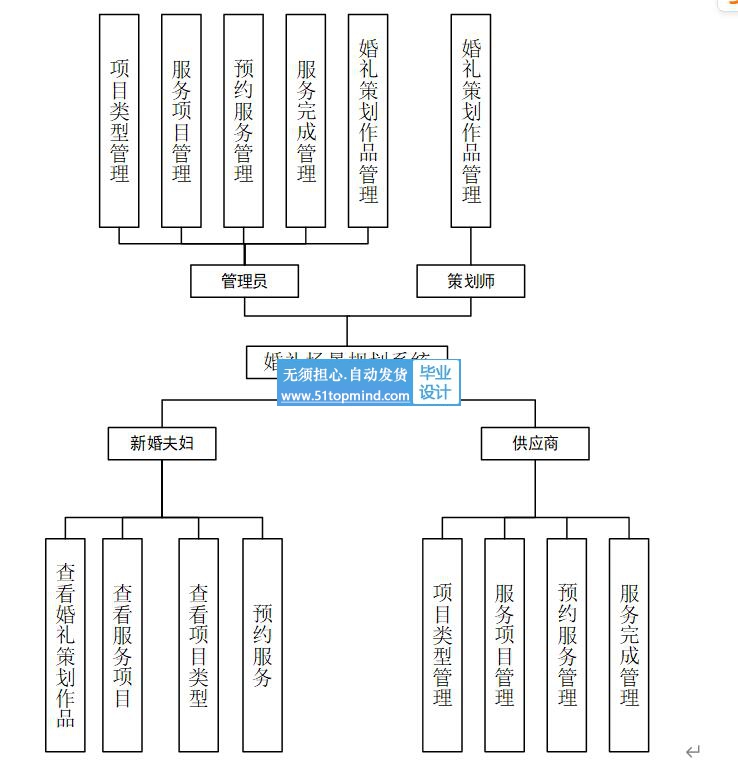本系统为婚礼场景规划提供一站式服务,新婚夫妇可查看婚礼策划作品、服务项目及类型,并预约服务。供应商能管理项目类型、服务项目、预约及服务完成情况。策划师负责婚礼策划作品管理,管理员统筹项目类型、服务项目、预约、服务完成及策划作品管理,满足多方需求,提升婚礼策划效率与服务质量。