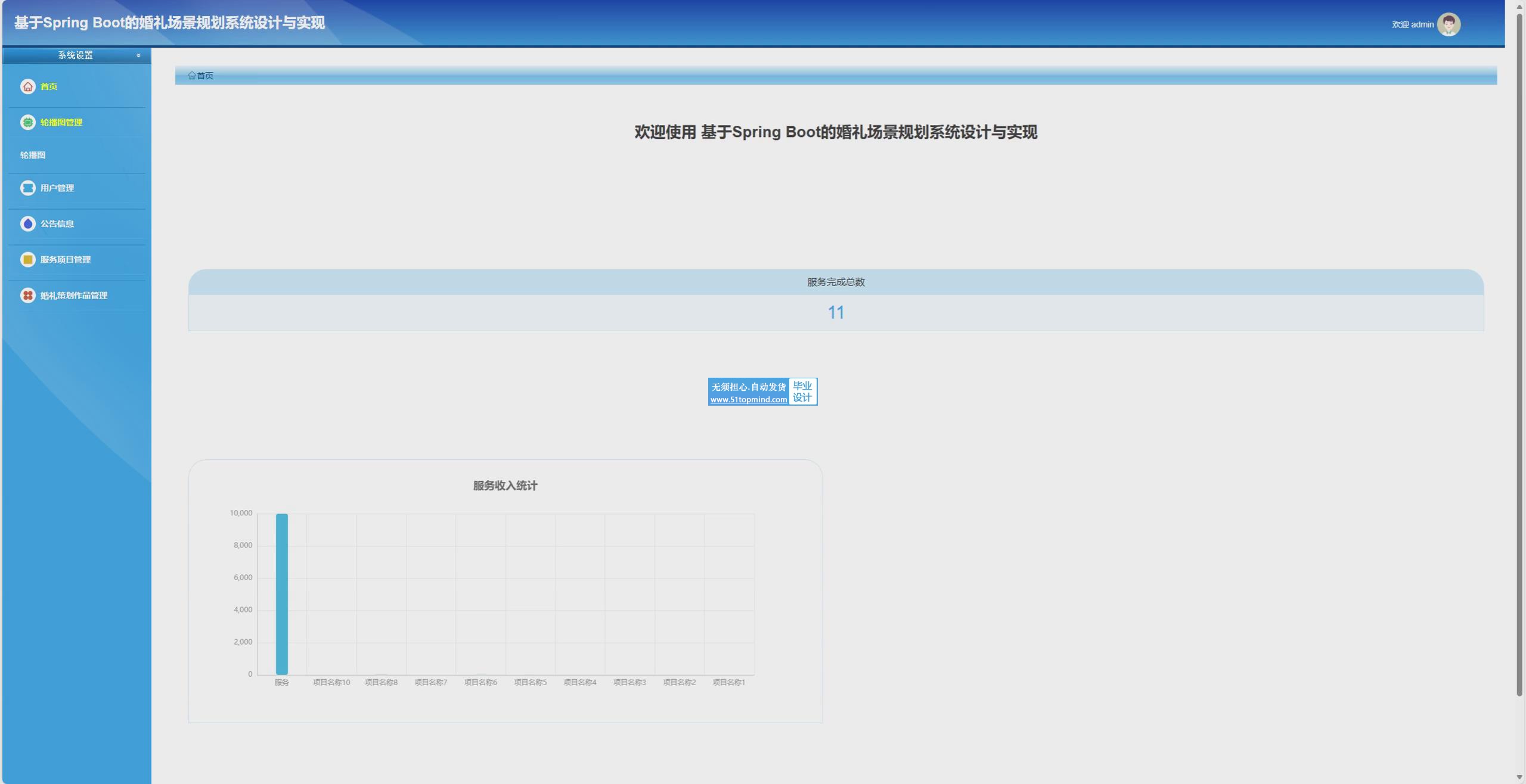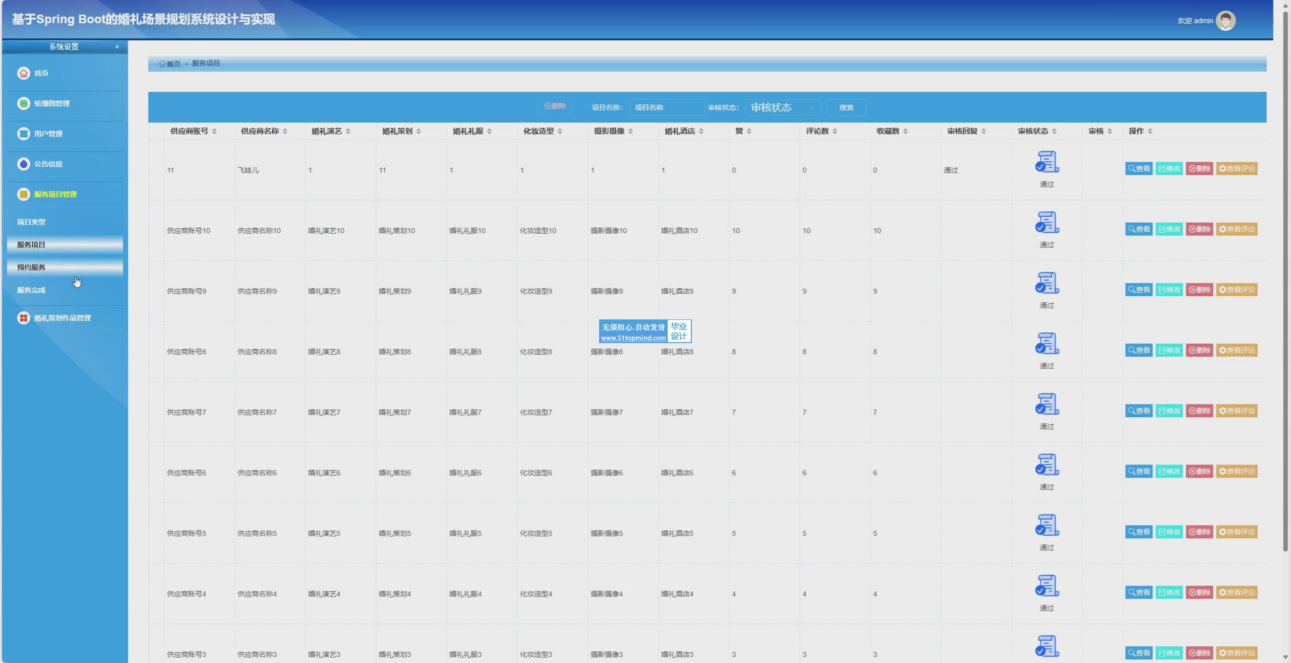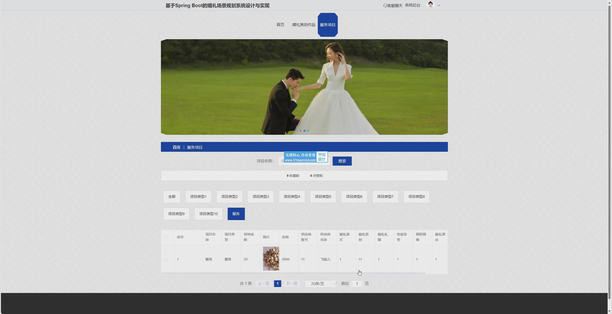随着互联网技术发展,传统婚礼服务行业运行模式存在诸多问题。新婚夫妇获取婚礼策划信息渠道有限,流程繁琐,信息不透明,难以高效预约服务。供应商管理项目和服务预约依赖人工,效率低下,易出错。策划师作品展示和管理缺乏系统化,难以精准触达客户。管理员统筹管理难度大,信息整合困难。为此,开发基于SpringBoot的婚礼场景规划系统,前端采用Vue技术,后端基于SpringBoot框架,数据库选用MySQL。系统功能涵盖新婚夫妇查看婚礼策划作品、服务项目、服务类型,预约服务;供应商管理项目类型、服务项目、预约服务、服务完成情况;策划师管理婚礼策划作品;管理员全面管理项目类型、服务项目、预约服务、服务完成情况及婚礼策划作品。