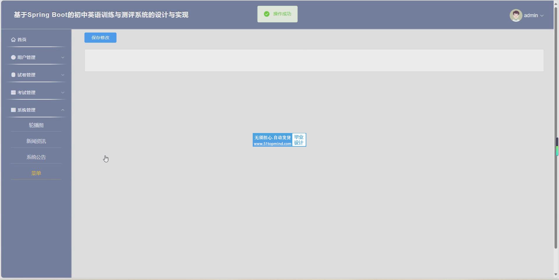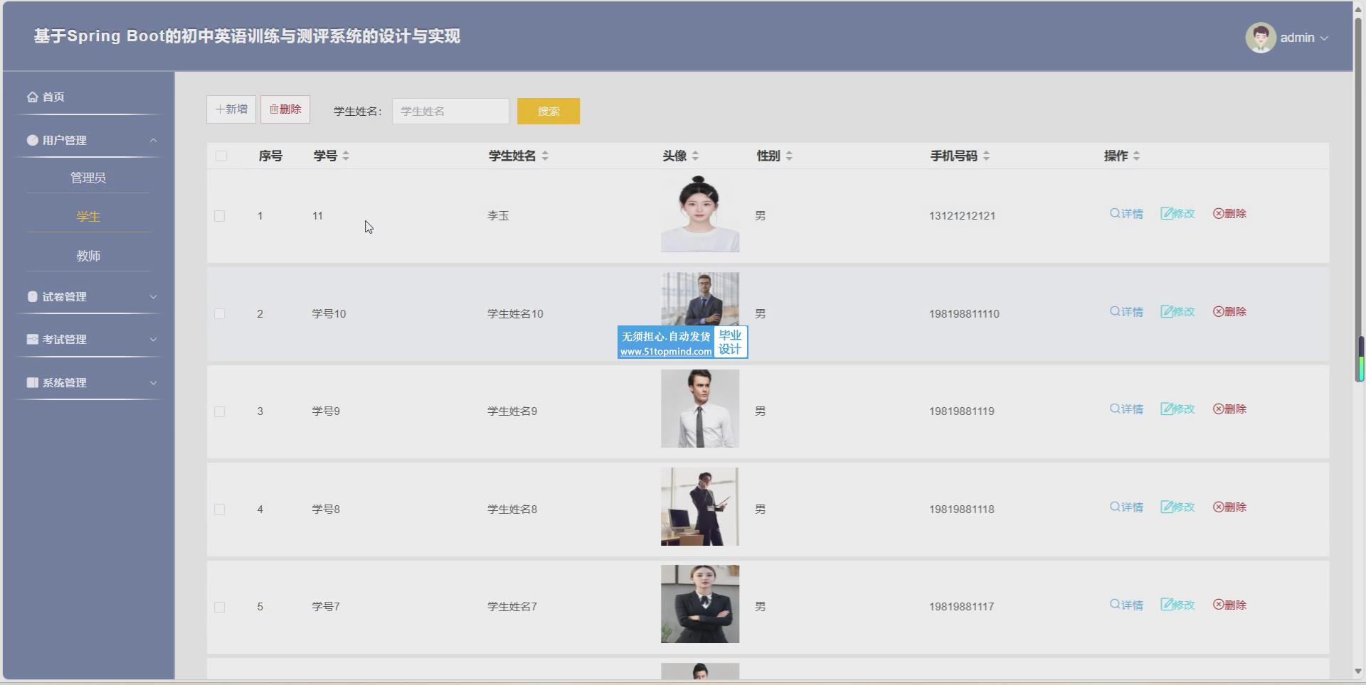基于Spring Boot的初中英语训练与测评系统旨在通过系统为初中生提供个性化的训练和测评一体化解决方案,主要用户及功能:(1)用户:初中生、英语老师和系统管理员。(2)主要功能包括:a.初中生信息管理;b. 试题管理;c.英语训练;d.英语测评。