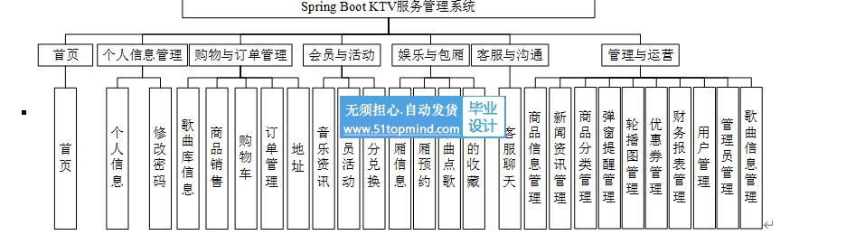 KTV服务管理系统将各功能分为多个功能模块,KTV服务管理系统集成了丰富的功能,以满足用户和管理员的多样化需求。在首页,用户和管理员均可轻松访问。用户可以在个人中心管理个人信息、修改密码,并通过歌曲库信息、商品销售页面浏览并选择心仪的内容。购物车、订单管理功能则让用户方便地管理自己的购物流程,包括添加地址信息。此外,用户还能享受音乐资讯、会员活动以及积分兑换等会员专属福利,同时参与娱乐与包厢功能,如查看包厢信息、预约包厢、点歌以及管理个人收藏。客服聊天功能为用户提供了与客服团队的便捷沟通渠道。管理员则拥有全面的管理与运营权限,包括商品信息管理、新闻资讯发布、商品分类设置、弹窗提醒与轮播图管理、优惠券发放、财务报表查看以及用户与管理员账户的管理。同时,管理员还能高效管理歌曲信息,确保KTV服务管理系统的顺畅运行