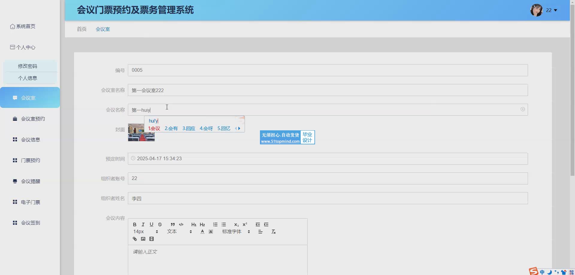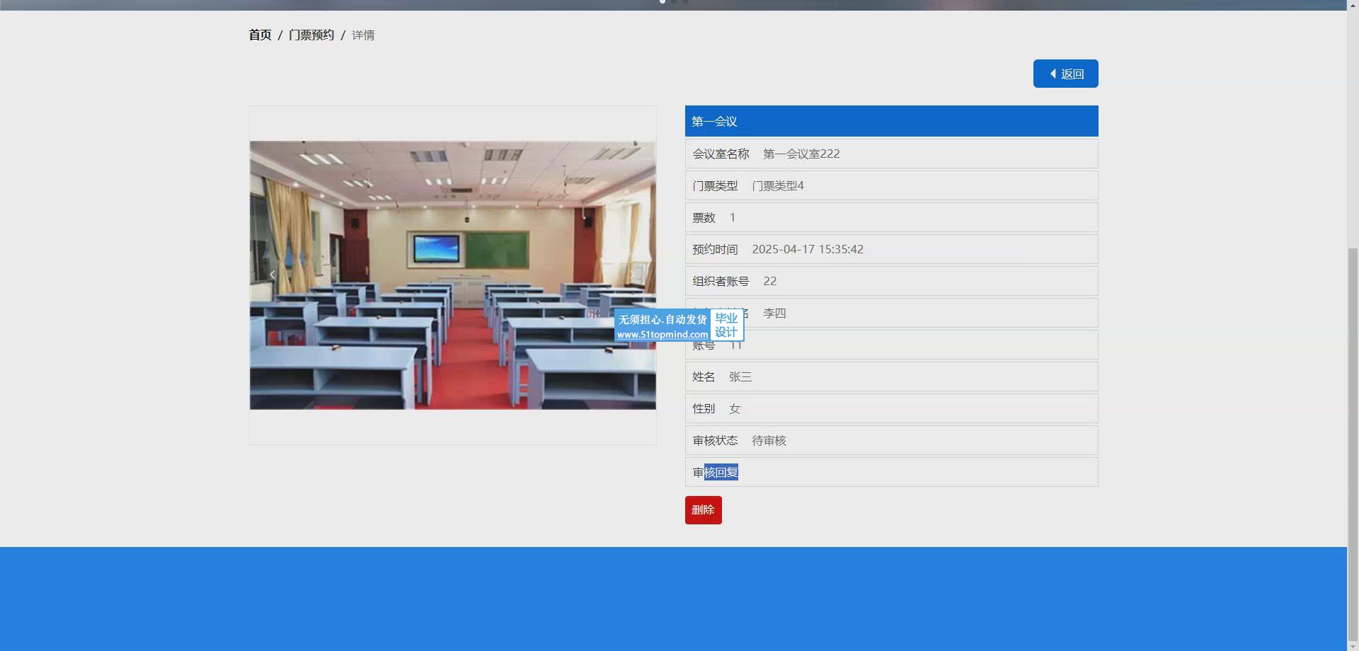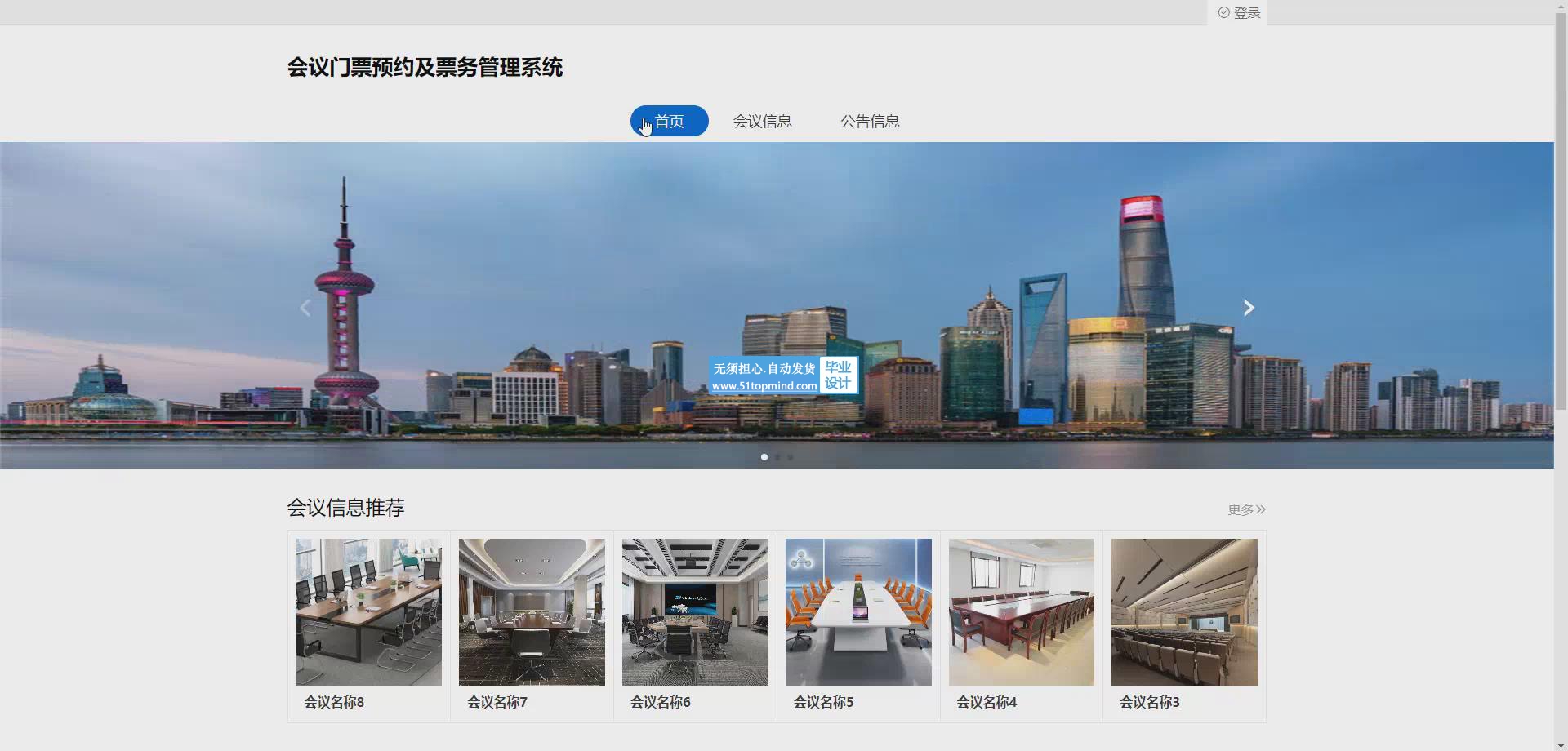 随着会议活动的日益频繁,传统的会议门票预约及票务管理方式已难以满足多样化需求。本文基于 Springboot 框架设计并实现了会议门票预约及票务管理系统,旨在为参与人、组织者提供便捷高效的管理服务。系统涵盖会议室、会议室预约、门票类型、会议信息、门票预约、会议提醒、电子门票、会议签到等核心功能模块。通过对会议室资源的数字化管理,组织者可灵活设置会议室预约规则,合理分配会议场地;针对不同会议类型,系统支持多样化门票类型设定,实现精准售票。参与人能够在线完成会议门票预约,并实时接收会议提醒,凭借电子门票便捷签到。系统采用前后端分离架构,运用 MySQL 数据库存储数据,通过 Spring Security 实现权限控制,保障数据安全与系统稳定。该系统具备良好的兼容性、可扩展性与易用性,有效解决了传统会议管理流程繁琐、效率低下等问题,对提升会议管理水平与参会体验具有重要意义。