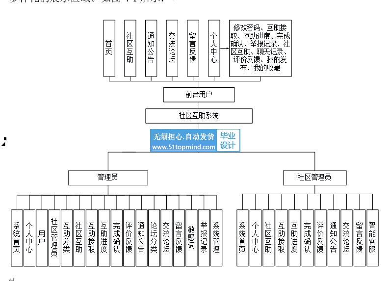 本系统主要分为三个子系统,分别是用户、社区管理员和管理员。用户内含:社区互助、交流论坛、留言反馈等功能。社区管理员包括;社区互助、互助接取、互助进度、完成确认、评价反馈、通知公告等功能。管理员包括:用户、社区管理员、互助分类、社区互助、互助接取、互助进度、完成确认、评价反馈等功能。