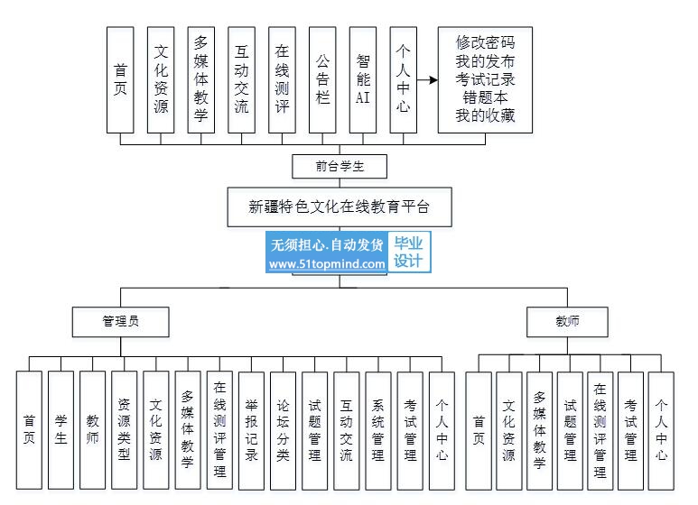 本系统采用Java语言结合Spring Boot框架进行开发,并利用MySQL数据库作为后台存储解决方案。整个系统被划分为三大核心模块:管理员模块、学生和教师模块。本文首先深入分析了新疆特色文化在线教育管理的业务流程,并据此明确了其功能性需求,进而设计了一个涵盖管理员、学生和教师三大角色的新疆特色文化在线教育平台。学生能够通过该系统浏览文化资源、多媒体教学、互动交流、在线测评、公告栏等;教师能够通过该系统浏览文化资源、多媒体教学、试题、在线测评、考试等管理;而管理员则可通过专属的后台管理界面执行用户信息管理等一系列操作[7]。