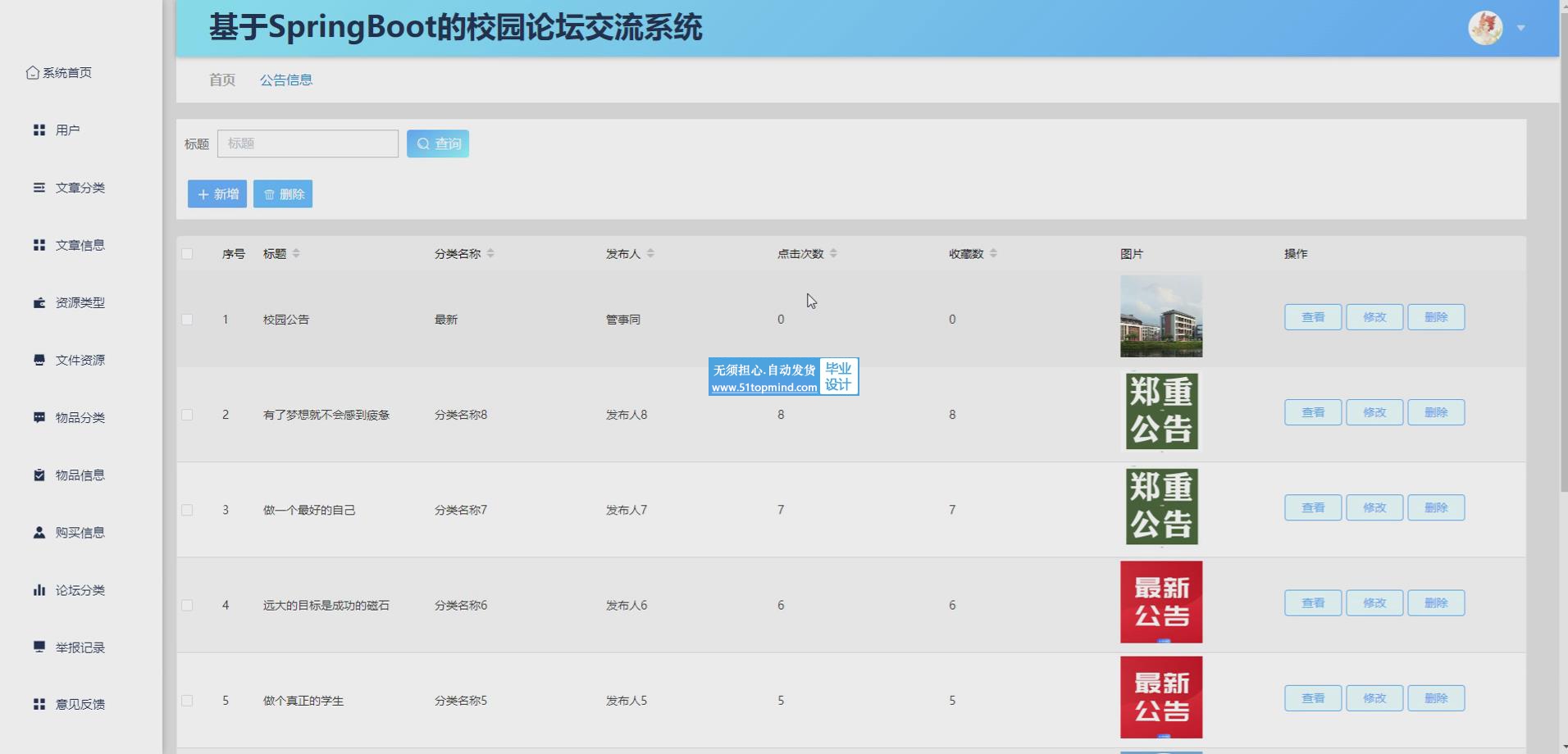为了达成安全、高效的管理目标,构建一套信息化、动态响应、用户友好且高效的校园论坛交流管理系统变得至关重要。现有的信息管理系统普遍遭受工作效率低和流程复杂等问题的困扰,特别是在校园论坛交流管理领域,尚缺乏成熟完善的信息化系统机制。针对这一现状,我们结合校园论坛交流管理体系的既有特点,并融入新技术,成功研发出基于Spring Boot框架的校园论坛交流信息化管理系统。该系统紧密贴合实际需求,明确划分为管理员和用户两大用户角色,并精心设计了包括文章信息、文件资源、物品信息、购买信息、论坛交流等多个核心功能模块。