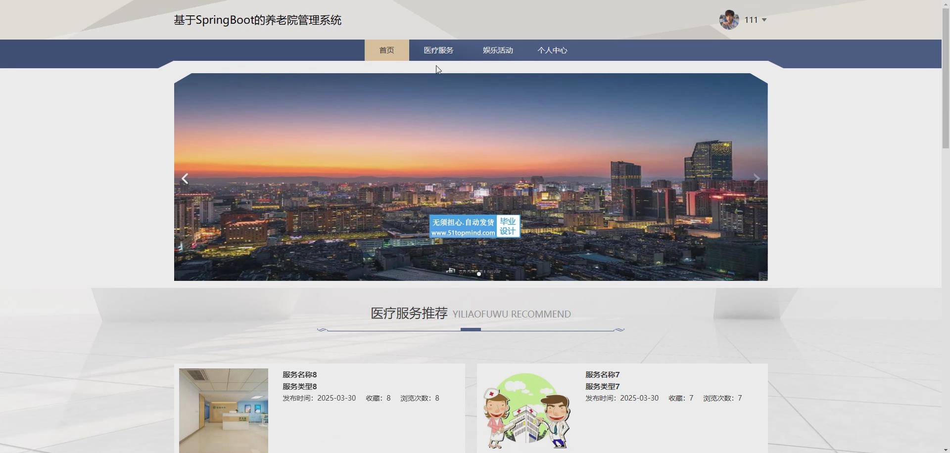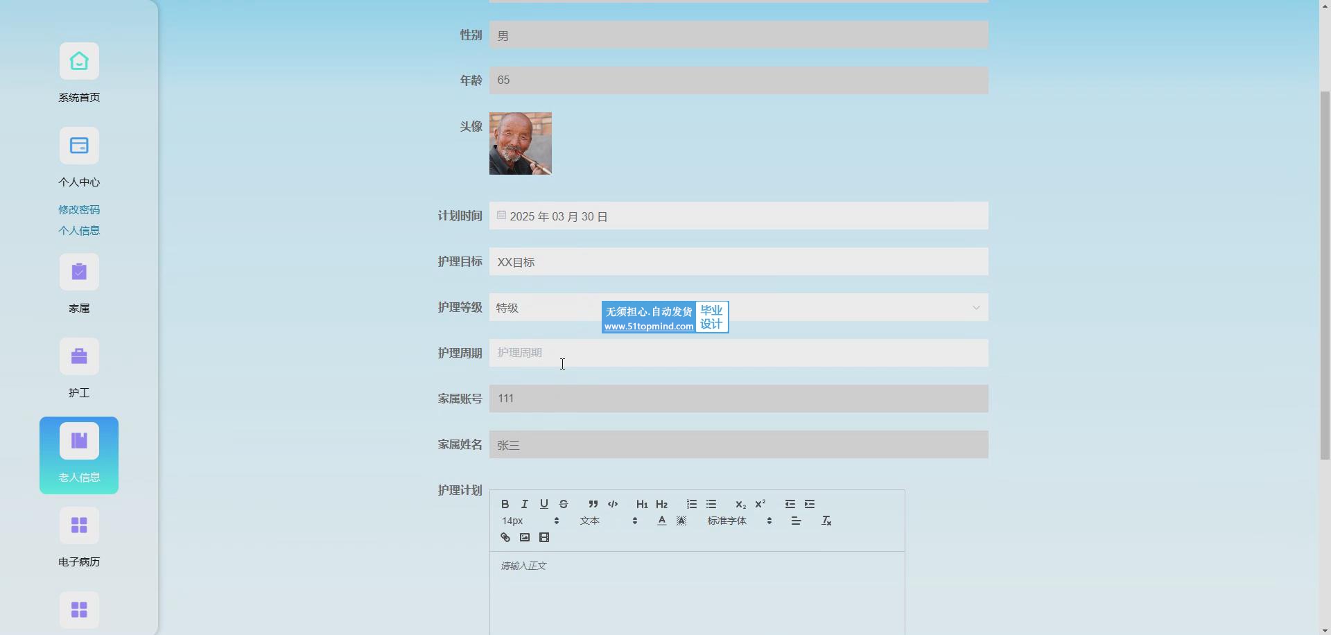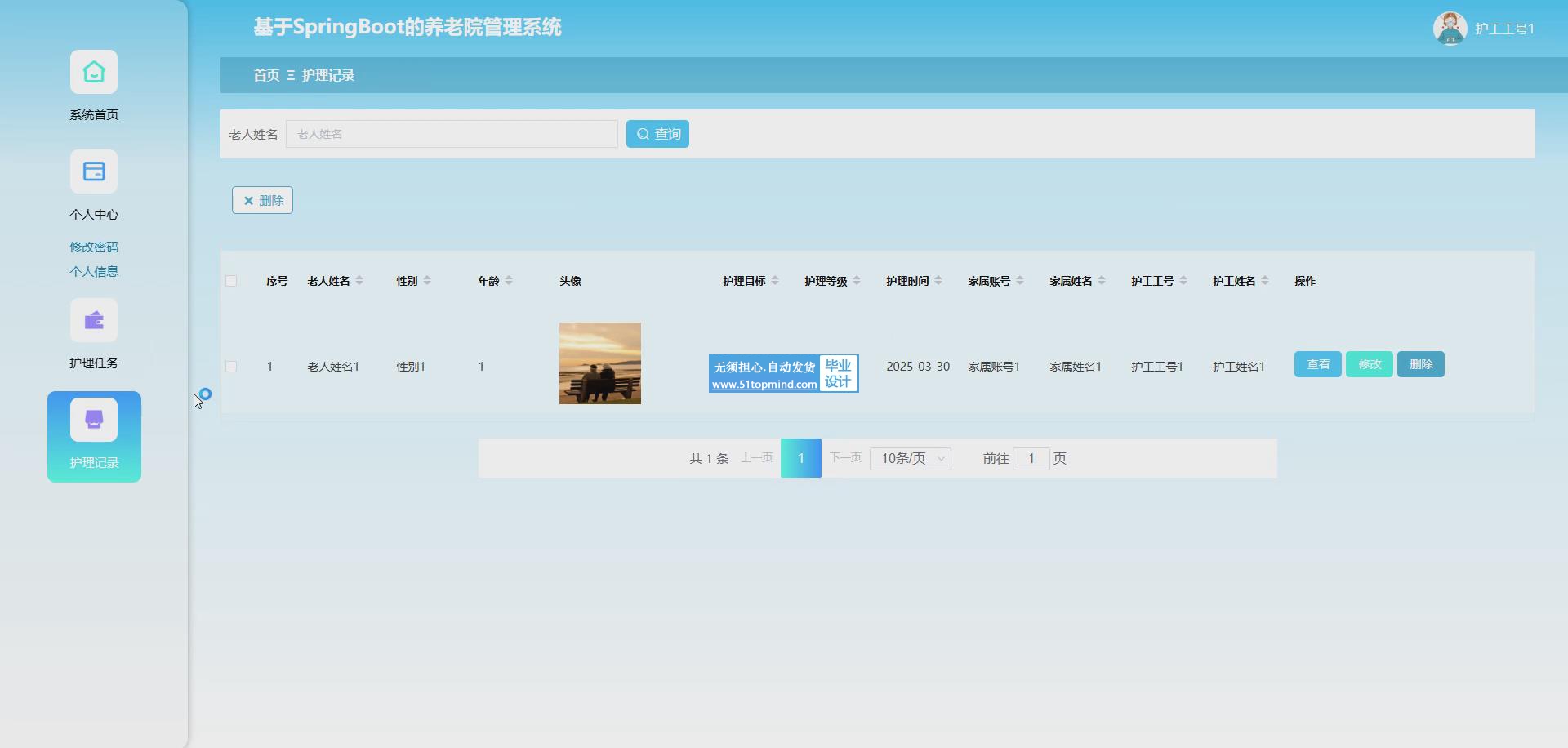本系统采用Java语言结合Spring Boot框架进行开发,并利用MySQL数据库作为后台存储解决方案。整个系统被划分为三大核心模块:管理员模块、家属和护工模块。本文首先深入分析了养老院管理的业务流程,并据此明确了其功能性需求,进而设计了一个涵盖管理员、家属和护工三大角色的养老院管理系统。家属能够通过该系统浏览医疗服务、娱乐活动等;护工能够通过该系统浏览护理任务、护理记录等;而管理员则可通过专属的后台管理界面执行用户信息管理等一系列操作[7]。