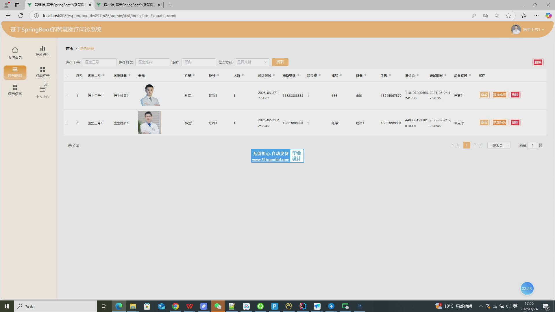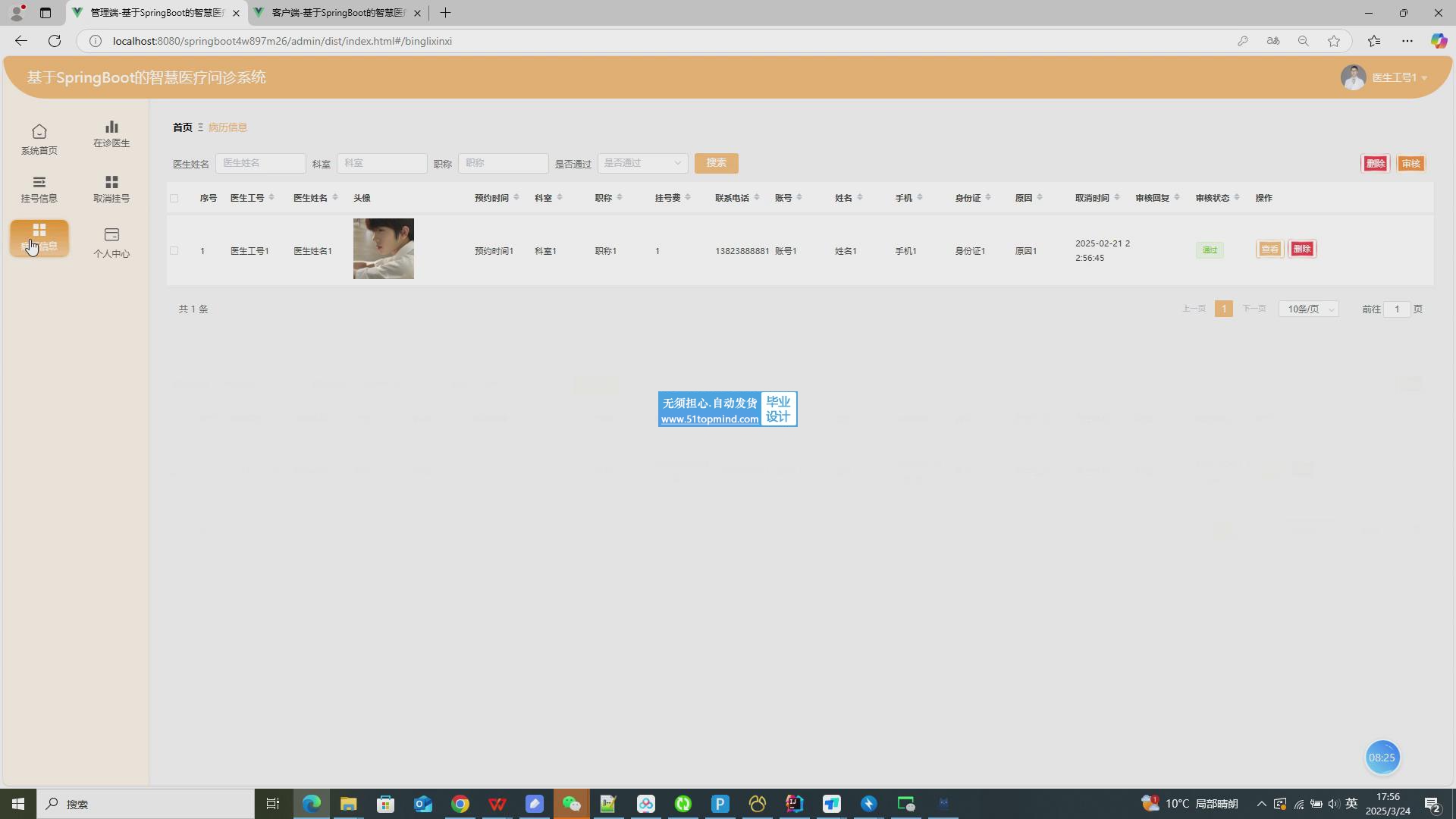 本文将讲述设计开发一个智慧医疗问诊系统,这个智慧医疗问诊系统包括二个部分:前台与后台。系统管理员通过后台可以管理所有用户信息,分配用户的角色。同时管理员还可以管理包括患者、医生、科室、系统管理、订单管理等。患者可以通过注册、登录系统查看在诊医生、药品信息、医疗资讯等。医生可以通过注册、登录系统查看挂号信息、取消挂号、病历信息等管理功能。本系统的开发基于Java语言,使用springboot框架构建代码,使整个系统的逻辑更清楚,并利用springboot内置的功能与数据库相连,而数据库则选用MYSQL作为数据管理工具。系统在设计过程中,运用了面向对象的设计理念,将系统的一些功能封装,实现了多个位置的重用。