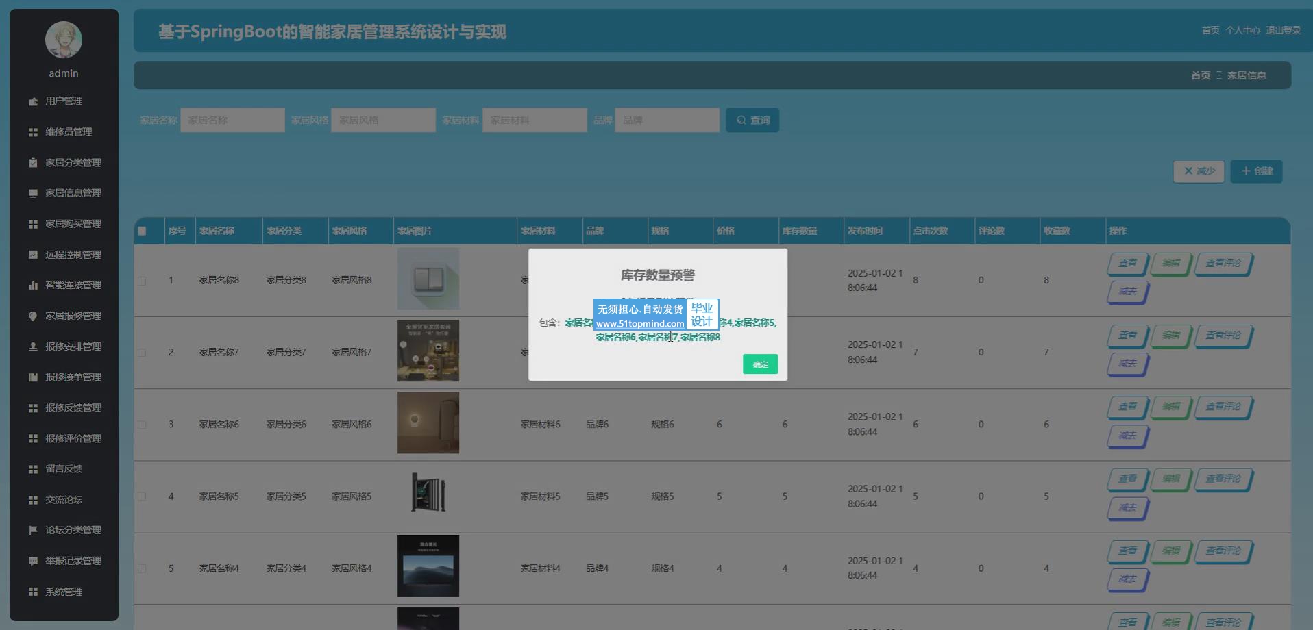 管理员可以在系统上实现对家居信息管理、家居购买管理、远程控制管理、智能连接管理、家居报修管理、报修安排管理、报修接单管理、报修反馈管理、报修评价管理等的增删改查操作等。