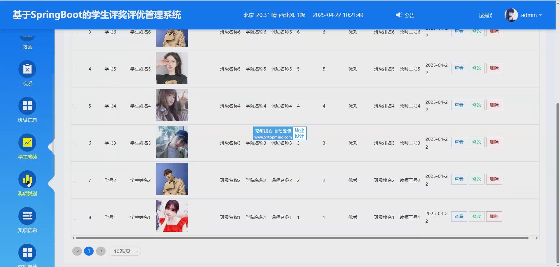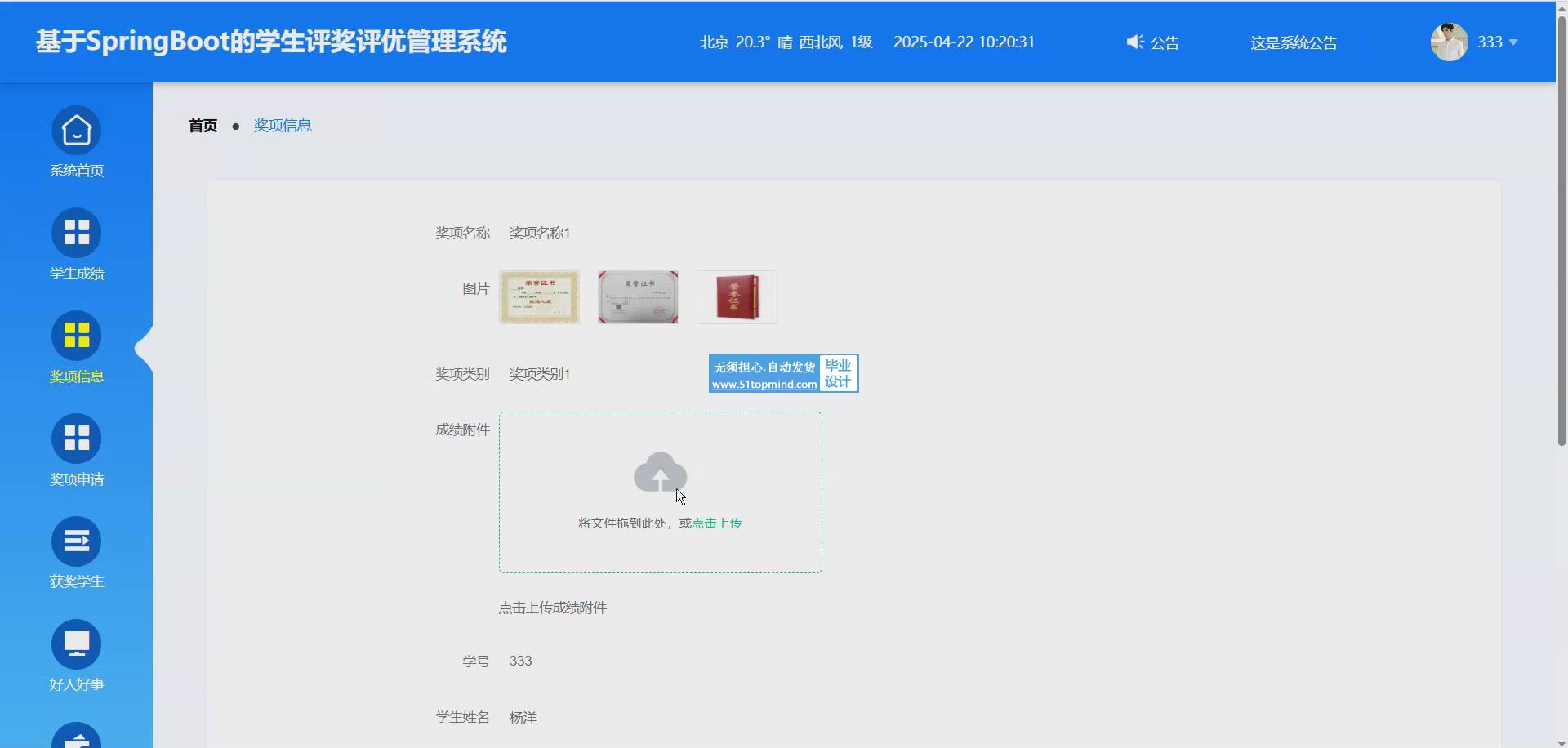 本研究以 JAVA 编程语言的技术架构为基础,融合SpringBoot框架与MySQL数据库技术体系,选用 IDEA 集成开发环境当作开发平台,设计并达成了一套智能化程度颇高的学生评奖评优管理系统,该系统在功能模块设计方面达成了多维度覆盖,如学生成绩管理、奖项信息维护、在线申请处理、获奖学生公示、好人好事记录以及异议反馈机制等核心功能模块,构建起完整的评奖评优管理闭环。实证研究显示,该系统的应用对传统评奖评优管理流程有优化作用,在提高管理效率的同时还改善了用户体验,这一研究成果为高校评奖评优管理工作提供了智能化解决办法,也为相关领域的信息化建设提供了可供参考的技术路径。
