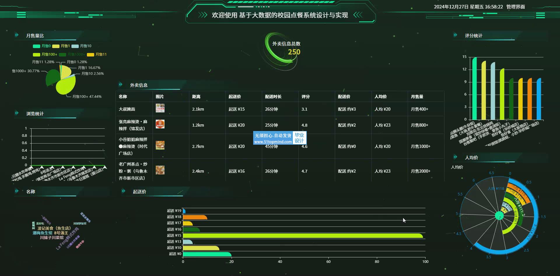 随着社会的不断发展,互联网数据时代的到来,数据的背后是什么,数据有什么用,怎么用庞大的数据来呈现出数据的价值,让我们一起去揭开这个神秘的面纱吧。基于大数据的校园点餐系统是一种创新性的餐饮服务模式,旨在提升校园内餐饮服务的效率与质量。系统还能根据实时订单数据,智能预测食堂的用餐高峰时段,帮助食堂合理调配食材与人力资源,减少食物浪费,提升运营效率。基于大数据的校园点餐系统还具备健康饮食分析功能,能够根据用户的饮食习惯提供营养建议,引导师生形成健康的饮食观念。