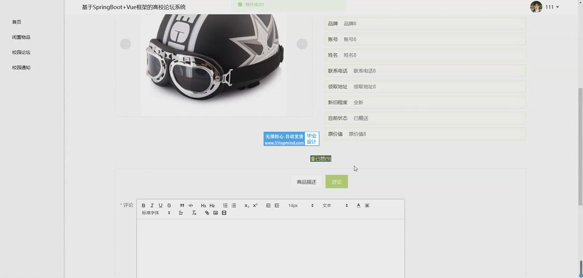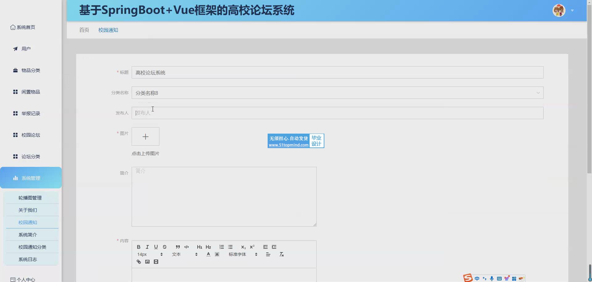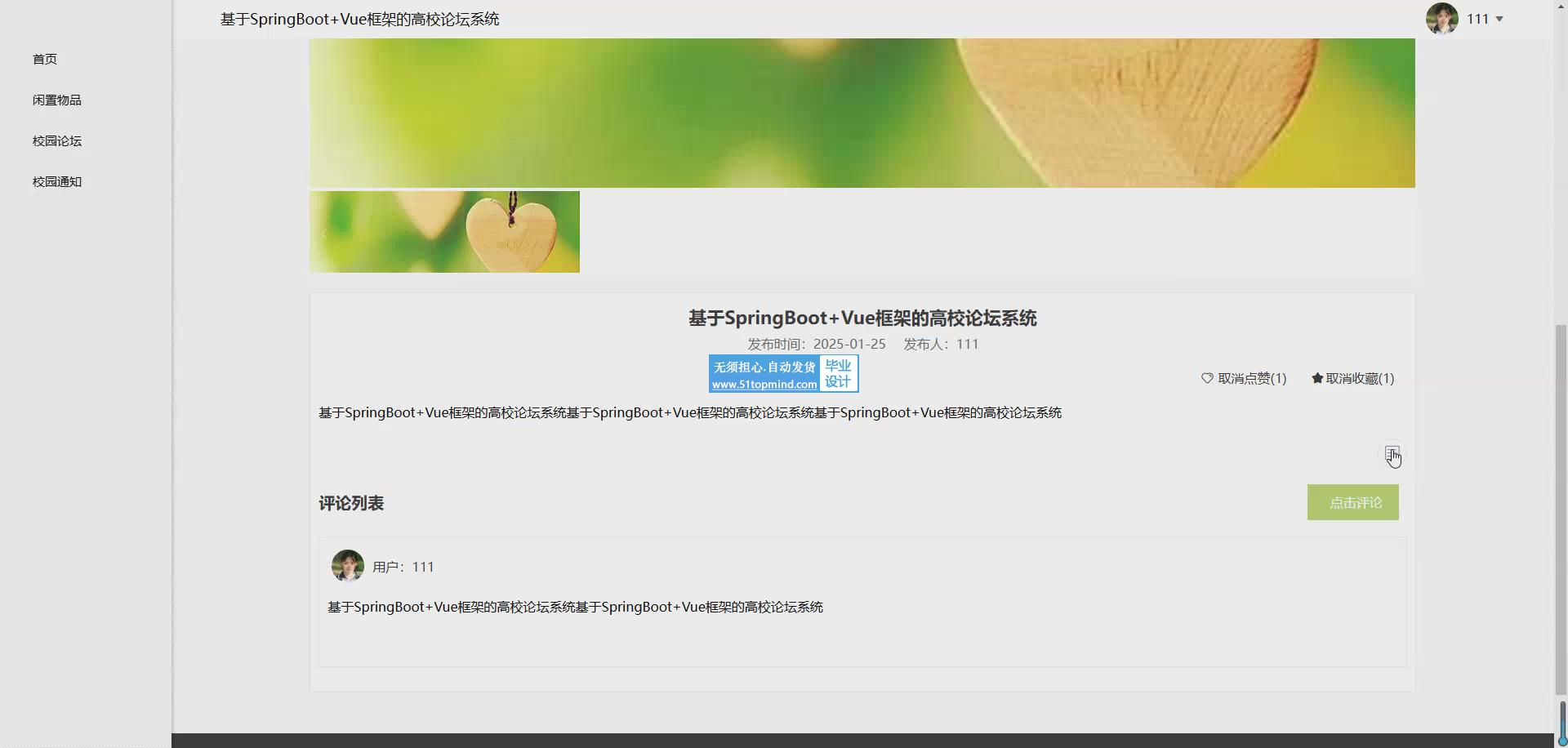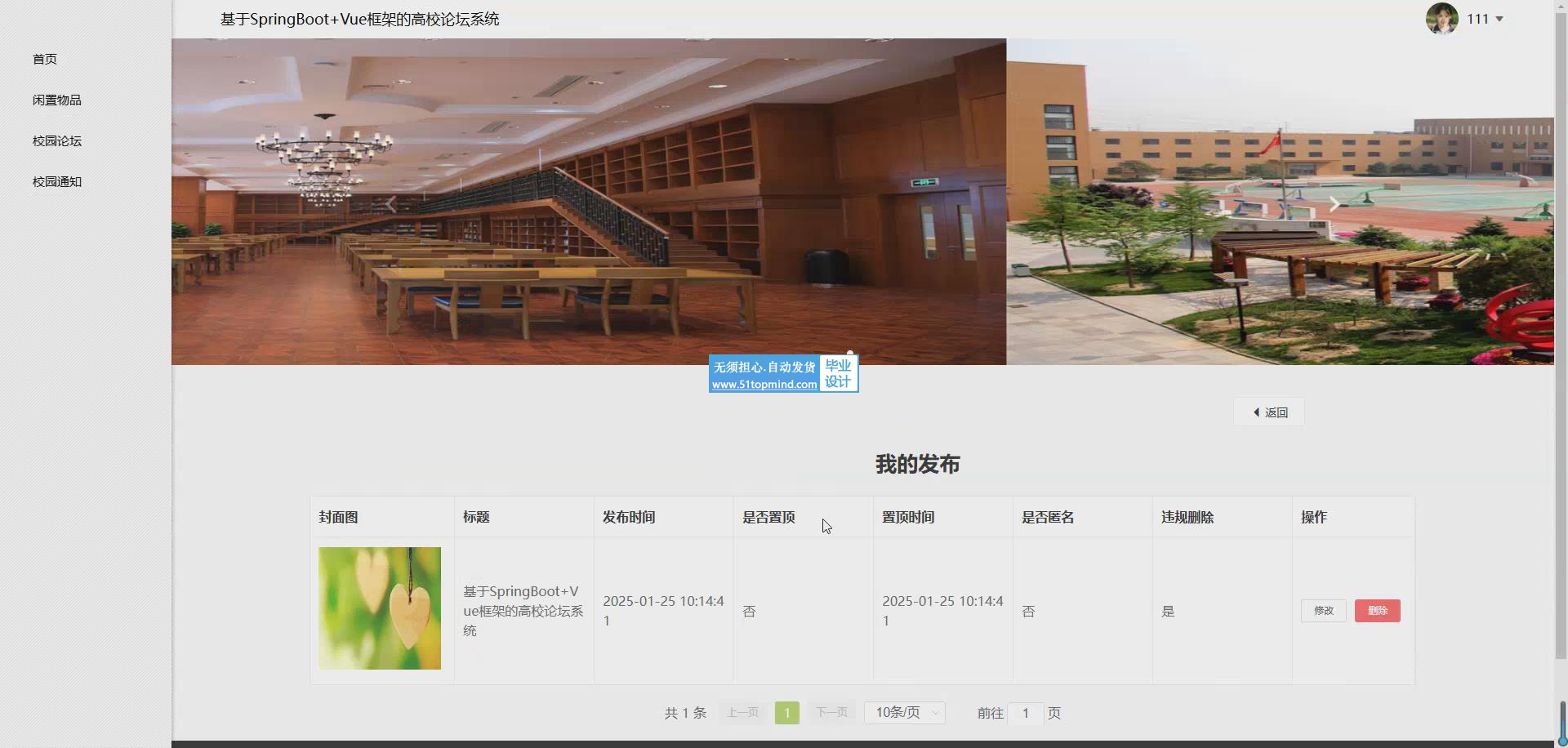 论坛首页可以按最新发布日期排列各个帖子,侧边栏可以选择不同的板块来查看不同类型的帖子,可以举报违规帖子;;用户可以上架出售闲置物品、购买别人的闲置物品,每个用户可以通过微信或支付宝充值余额。管理员负责用户的基本信息维护,可以进行闲置物品的发布,校园论坛信息管理,论坛分类管理、轮播图管理,公告管理等操作。