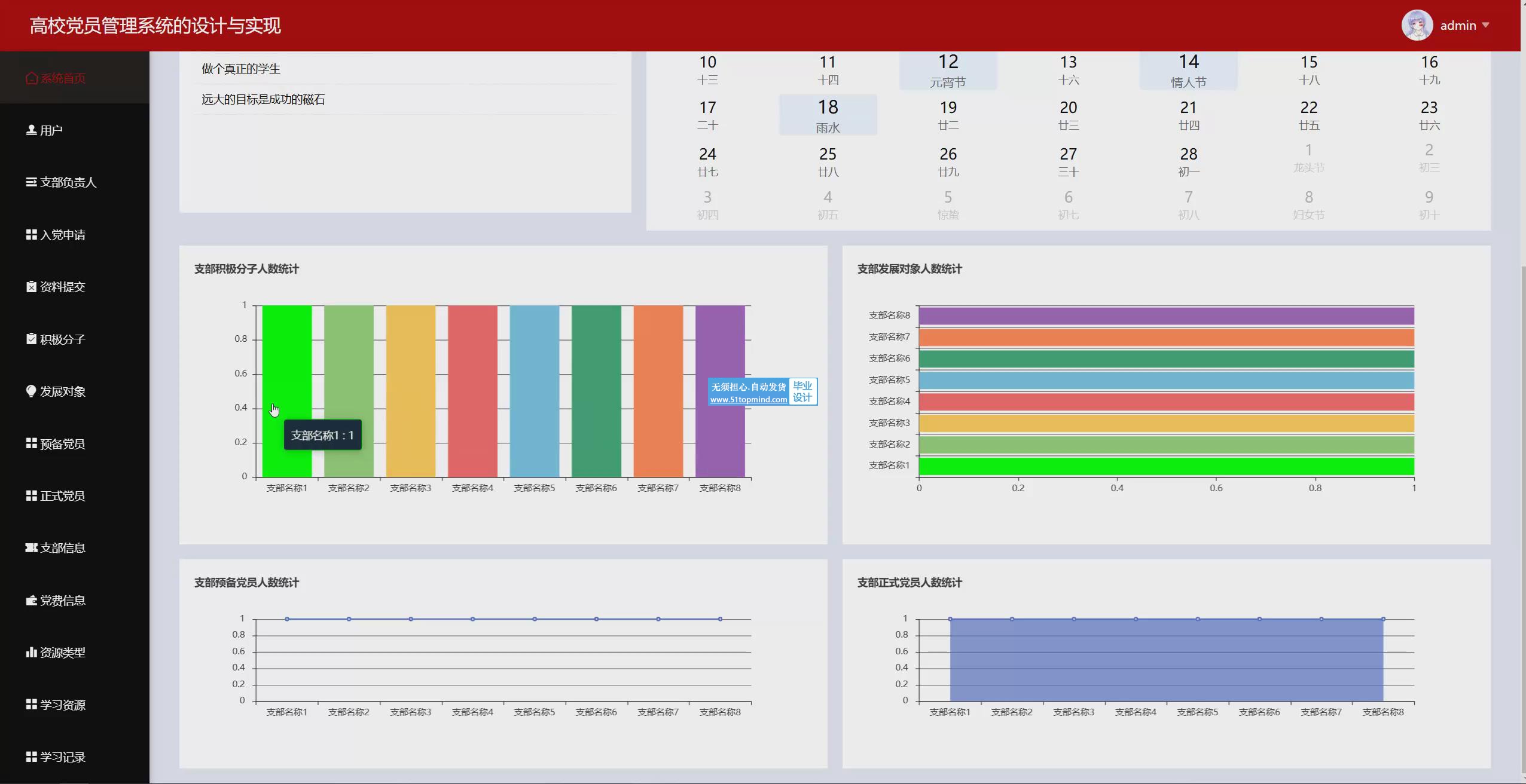 第 5 章:系统的实现,此章是对系统中用户、支部负责人以及管理员这三类角色的主要功能的页面进行展示,并对每一功能的页面进行文字描述,说明其作用和操作方法。