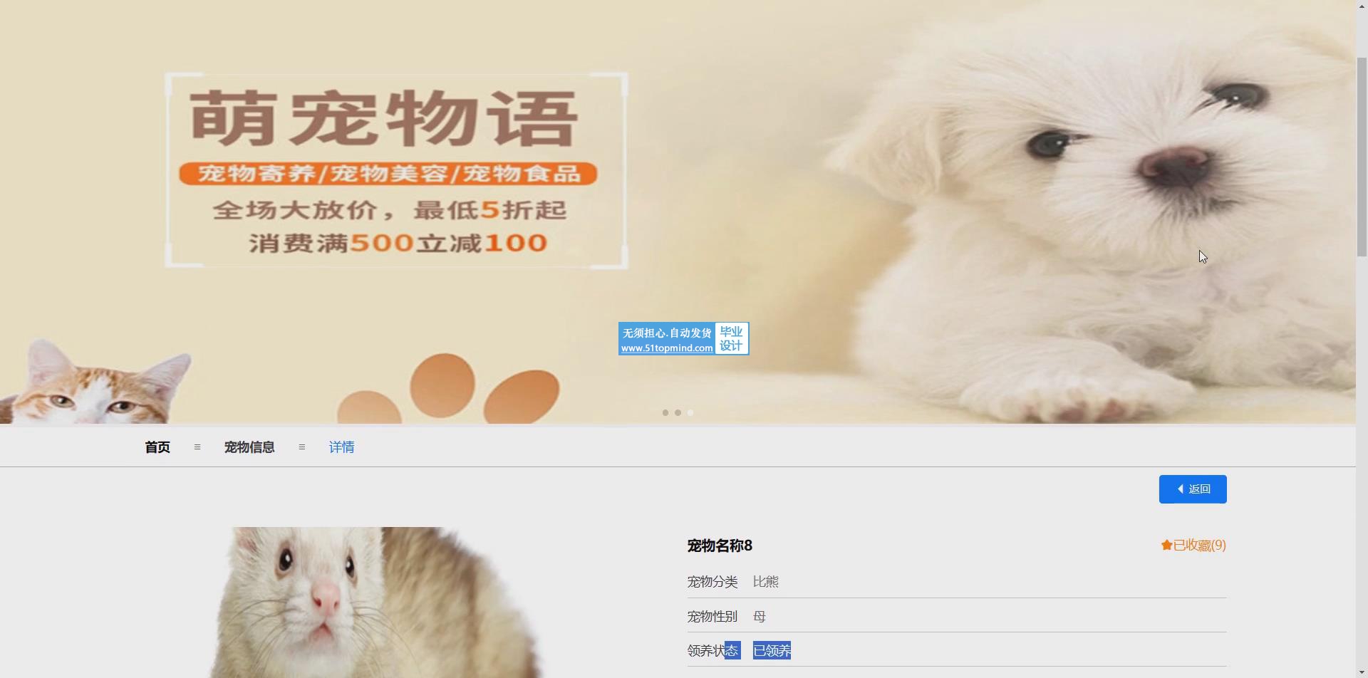 本系统采用B/S结构模式,支持多平台访问,用户无需下载客户端即可随时随地浏览和操作。同时,系统还具备良好的可扩展性和安全性,为宠物领养事业的健康发展提供了有力支持。