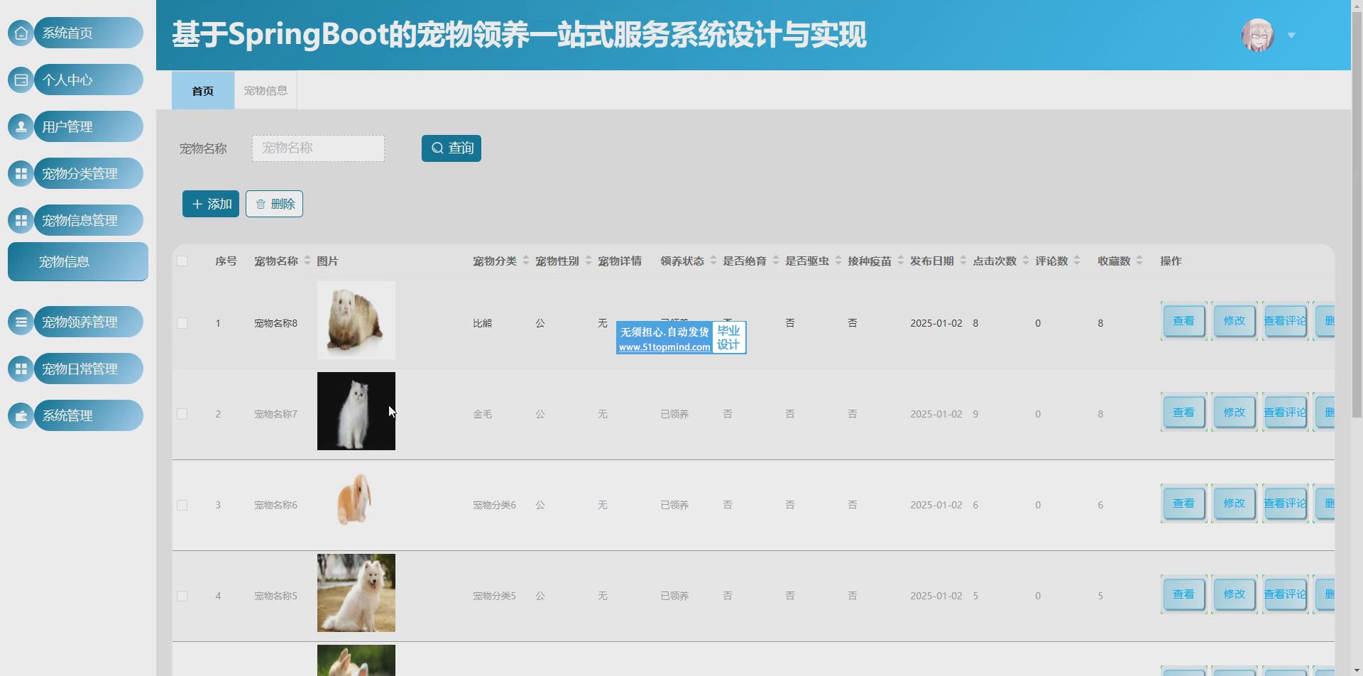 系统涵盖了宠物分类管理、宠物信息管理、宠物领养管理以及宠物日常管理四大核心功能模块。宠物分类管理模块实现了对宠物品种的细致划分,便于用户快速查找心仪的宠物类型;宠物信息管理模块则负责全面记录宠物的健康状况、疫苗接种情况、性格特点等关键信息,确保领养过程的透明度和安全性;宠物领养管理模块通过标准化的领养流程,提高了领养效率和成功率;宠物日常管理模块则提供了宠物日常护理、健康监测等实用功能,帮助领养者更好地照顾宠物。