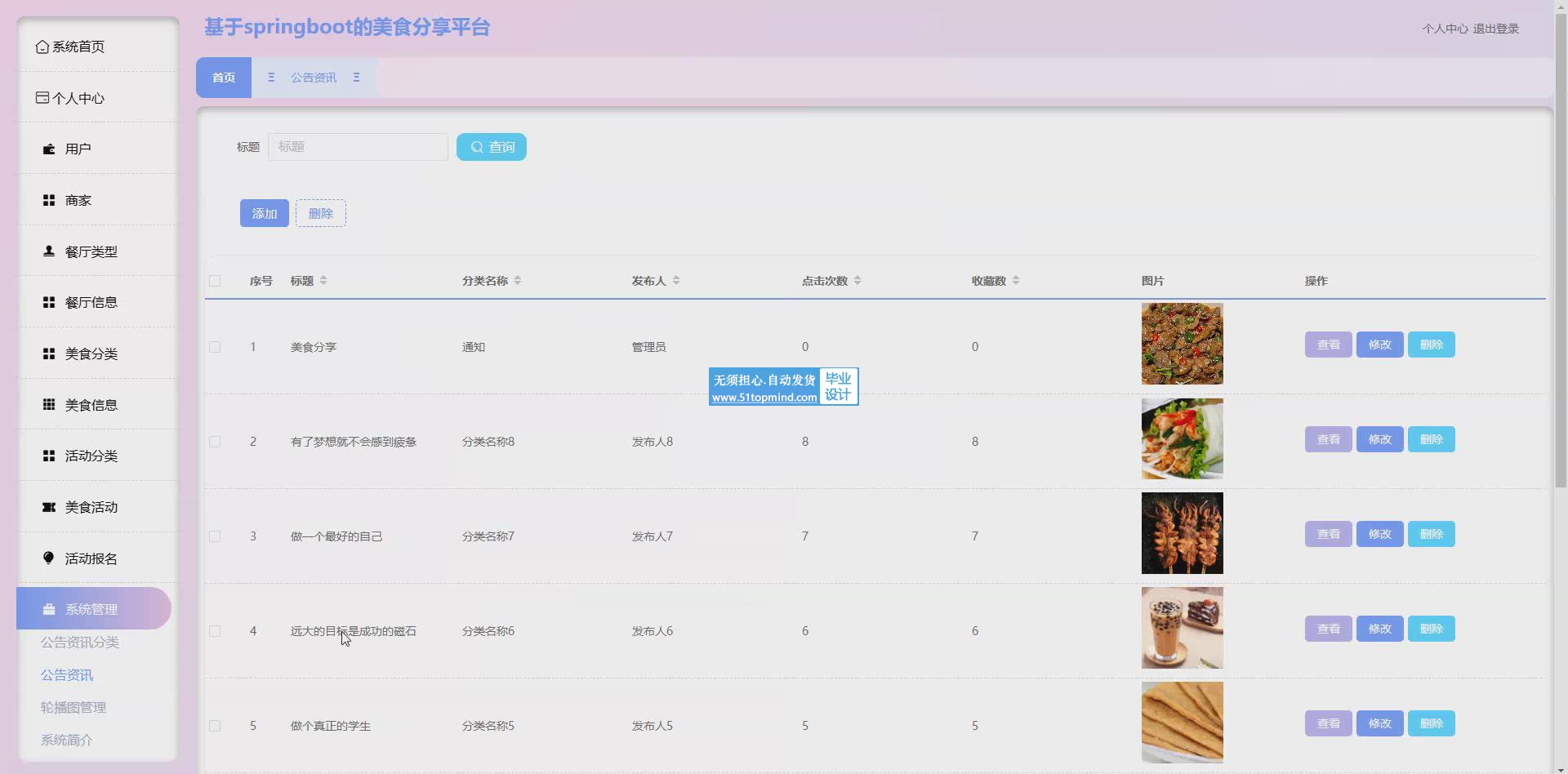 本文围绕基于 Spring Boot 的美食分享平台展开研究。阐述了在信息技术发展促使美食分享平台兴起的背景下,该平台在满足用户需求和技术应用创新方面的重要意义。详细分析了国内外美食分享平台的研究现状,介绍了开发所涉及的多种技术。通过可行性分析、角色与功能需求分析进行系统设计,涵盖系统结构、商家、用户、管理员功能设计及数据库设计。还阐述了系统开发与运行环境,并对商家、用户、管理员功能实现进行探讨,为美食分享平台的建设提供了全面的方案。