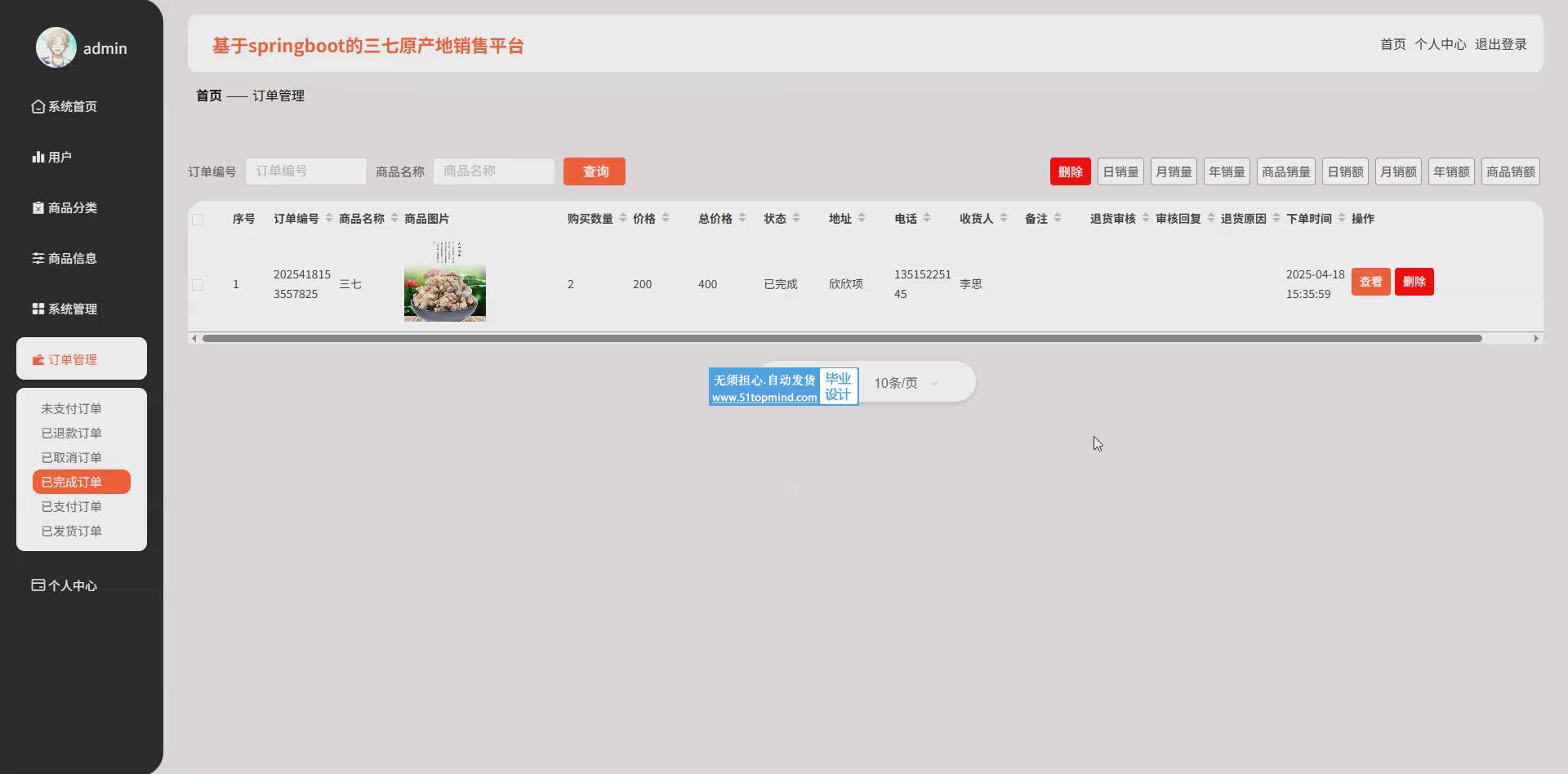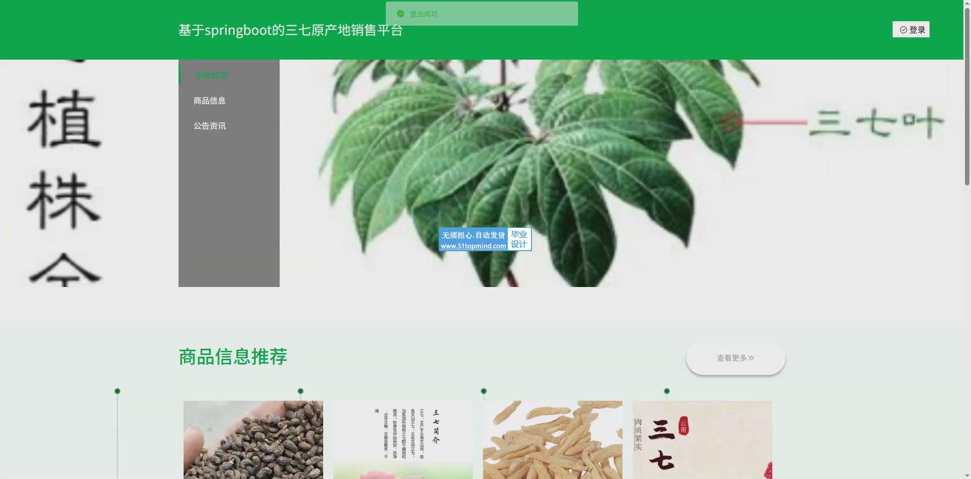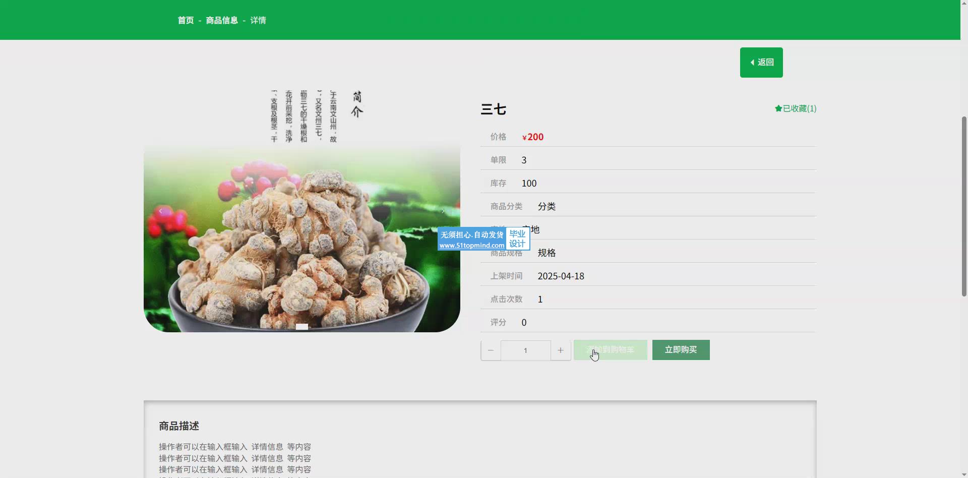 随着信息技术的飞速发展,电子商务平台已成为现代商业的重要组成部分。三七原产地销售平台基于 Java 语言和 Spring Boot 框架开发,采用 MySQL 数据库进行数据管理,为用户提供了一个高效、便捷的三七产品交易环境。平台涵盖了用户管理、商品分类、商品信息展示、系统管理、订单处理以及个人中心等核心功能模块。用户可以通过平台轻松浏览不同分类下的三七商品,查看详细的商品信息,包括产地、规格、价格等,并能进行收藏、评论和购买操作。商品分类模块使得商品管理更加清晰,方便用户快速定位所需产品。系统管理功能则为管理员提供了强大的后台支持,包括用户权限管理、商品上下架操作、订单审核等,确保平台的稳定运行。订单管理模块实现了订单的全流程跟踪,从下单、支付到物流配送,用户可以实时了解订单状态。个人中心为用户提供了一系列便捷功能,用户可以管理自己的地址信息、查看订单历史、修改个人信息等。整个平台设计注重用户体验,界面简洁友好,操作流程便捷高效,旨在打造一个专业、可靠的三七销售平台,推动三七产业的现代化发展。