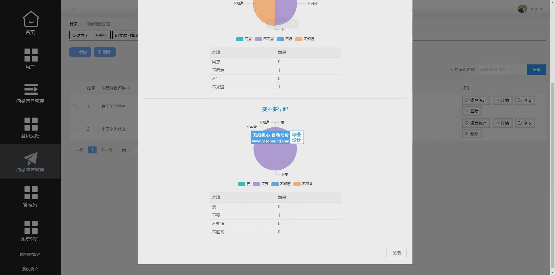 系统设计上,我们区分了管理员与用户两种角色,涵盖了用户管理、问卷题目的创建与维护、意见反馈收集、问卷调查的发布与监控、系统设置以及个人信息管理等多个功能模块。这样的结构设计旨在提供清晰的使用路径和高效的数据处理流程,以满足不同用户的使用需求并提升整体的系统性能。