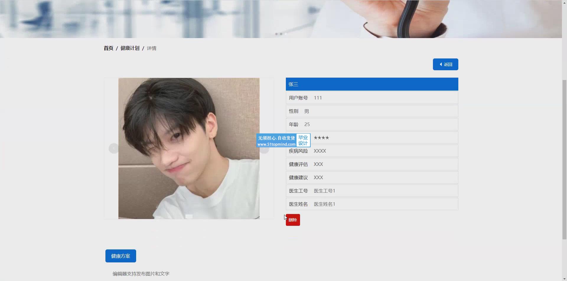 随着人们健康意识的不断提升,健康管理系统的需求日益增长。本项目基于SpringBoot架构与Vue.js前端框架,采用Java语言进行开发,并以MySQL数据库作为数据存储核心,致力于打造一个高效、便捷的健康管理平台。在后端,SpringBoot框架凭借其轻量级、易于开发与维护的特点,为系统的稳定运行提供了坚实保障,同时结合MySQL数据库强大的数据处理能力,能够高效地存储与管理用户的健康数据,如体检报告、运动记录、饮食习惯等。前端Vue.js的使用则让页面交互更加流畅自然,为用户提供了良好的使用体验。无论是数据的录入、查询还是分析,系统都能快速响应,为用户和医疗机构提供有力支持,助力健康管理事业的发展,让健康触手可及。
