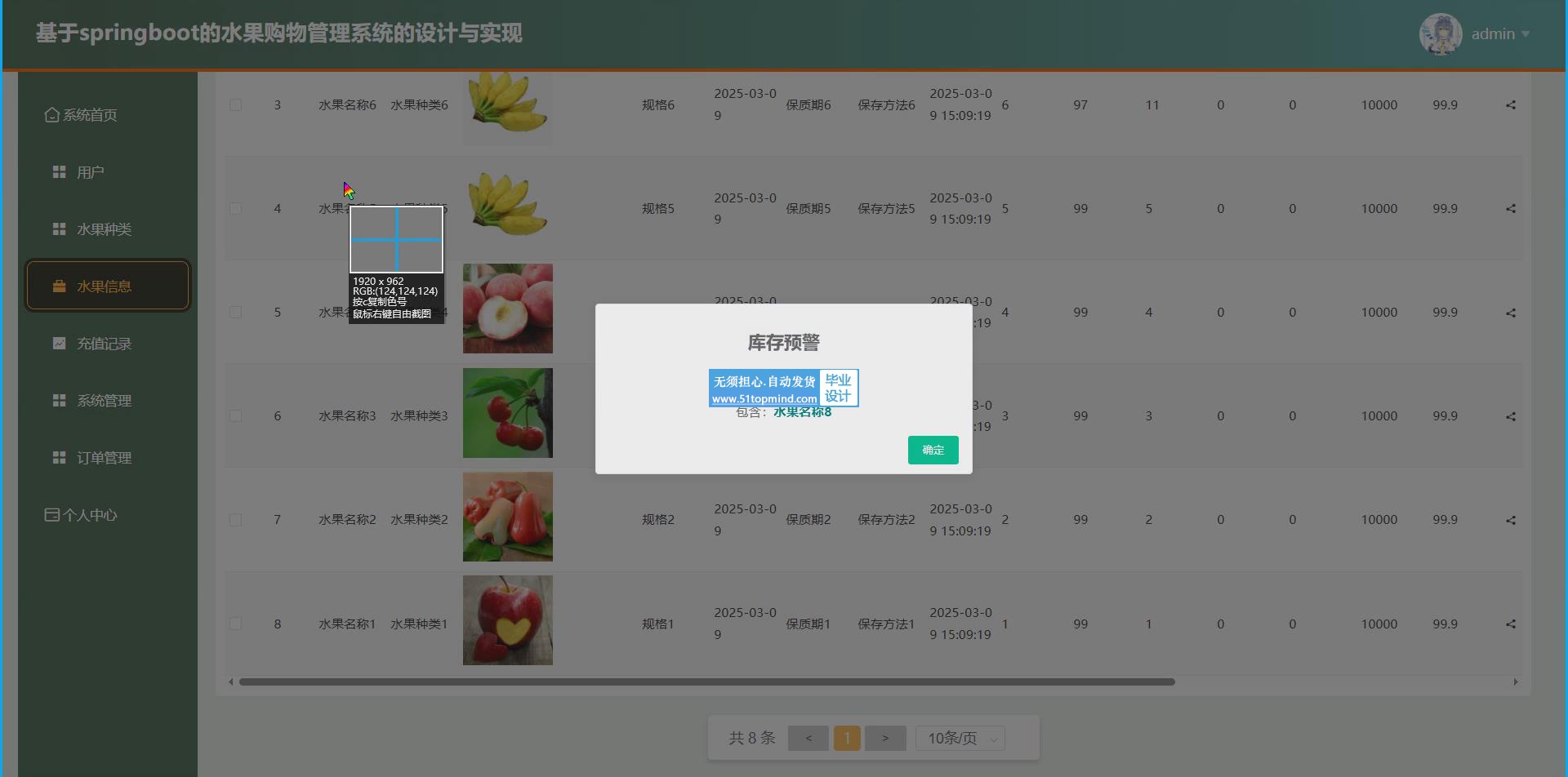 管理员功能:管理员拥有更高的权限可对自己信息或者用户信息进行查看与修改,上传水果信息,查看用户购物方面信息管理,会员方面信息管理等。