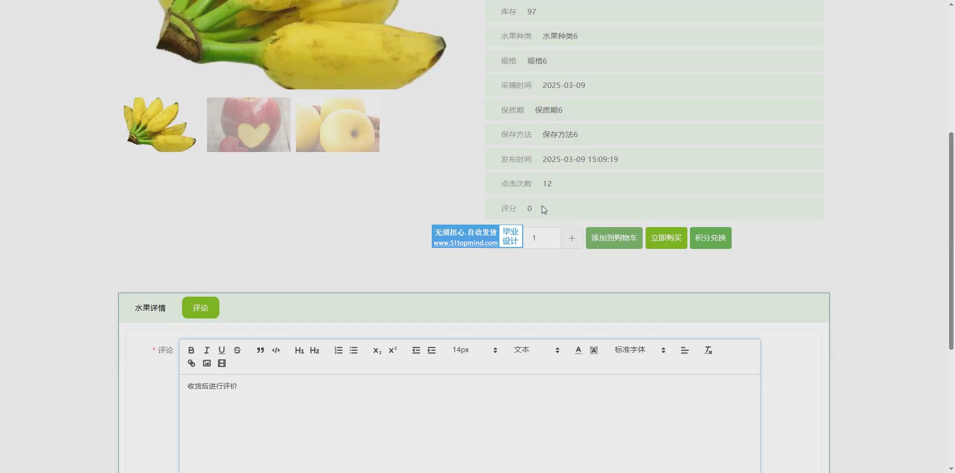 在线选购与结算功能:用户能够挑选心仪水果加入购物车,并能够随时检查购物车内的商品,进而完成选购到支付整个流程。
