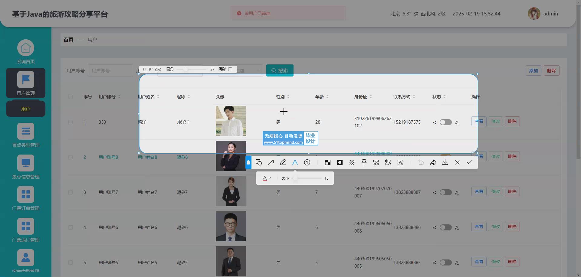 本研究围绕旅游攻略分享平台的功能设计与实现展开,旨在打造一个集用户互动、信息管理与旅游服务于一体的综合性平台。平台的核心功能包括用户管理、景点与客房信息管理、旅游攻略管理、订单处理以及系统维护等。用户管理模块支持用户注册、登录及个人信息管理,确保用户数据的安全性。景点与客房信息管理则涵盖景点类型、客房类型、景点与客房信息的增删改查,为用户提供全面的旅游资源。旅游攻略管理模块支持攻略的发布、审核、推荐与分类,鼓励用户分享旅行经验,同时通过敏感词管理确保内容合规。平台还提供门票、车票、客房的预订与退订管理,满足用户在旅行规划中的多样化需求。旅游交流功能通过论坛分类管理与举报记录管理,营造活跃且健康的社区氛围。系统管理模块则涵盖系统日志、轮播图管理与通知公告发布,提升平台的运营效率。通过这些功能的整合,平台不仅为用户提供了便捷的旅游信息服务,还通过智能推荐和个性化功能提升了用户体验。