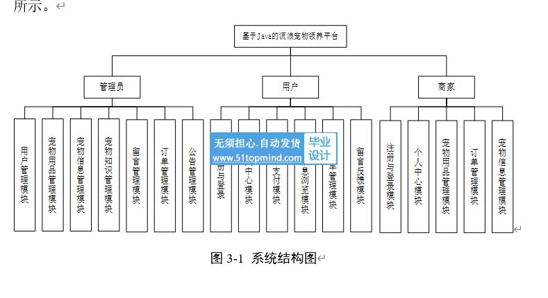 本平台采用分层式的架构,前端采用Vue.js做开发,后端依托Spring Boot框架开展,采用MySQL作为数据库,系统采用模块化的设计思路,主要由用户模块、宠物管理模块、领养申请模块、健康管理模块等组成,各模块设计的目标是实现平台功能的高效实施与管理的便利,系统设计采用前后端分离模式,实现了平台可扩展性与灵活性的保障,方便之后功能的扩展及维护事宜。