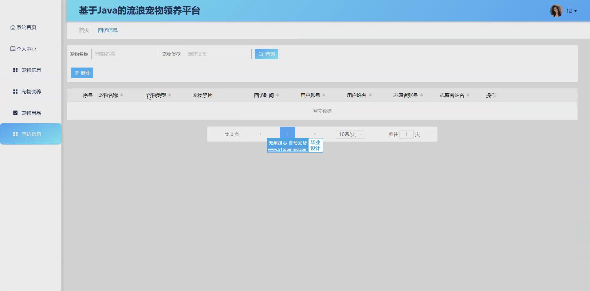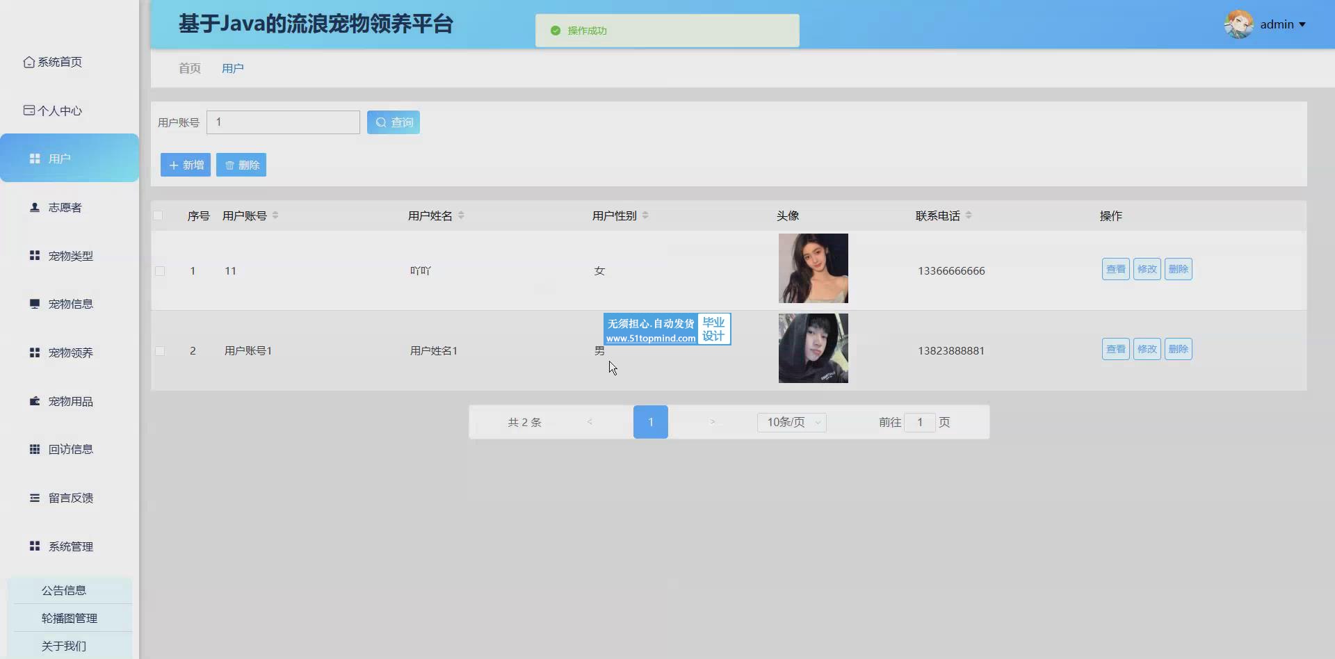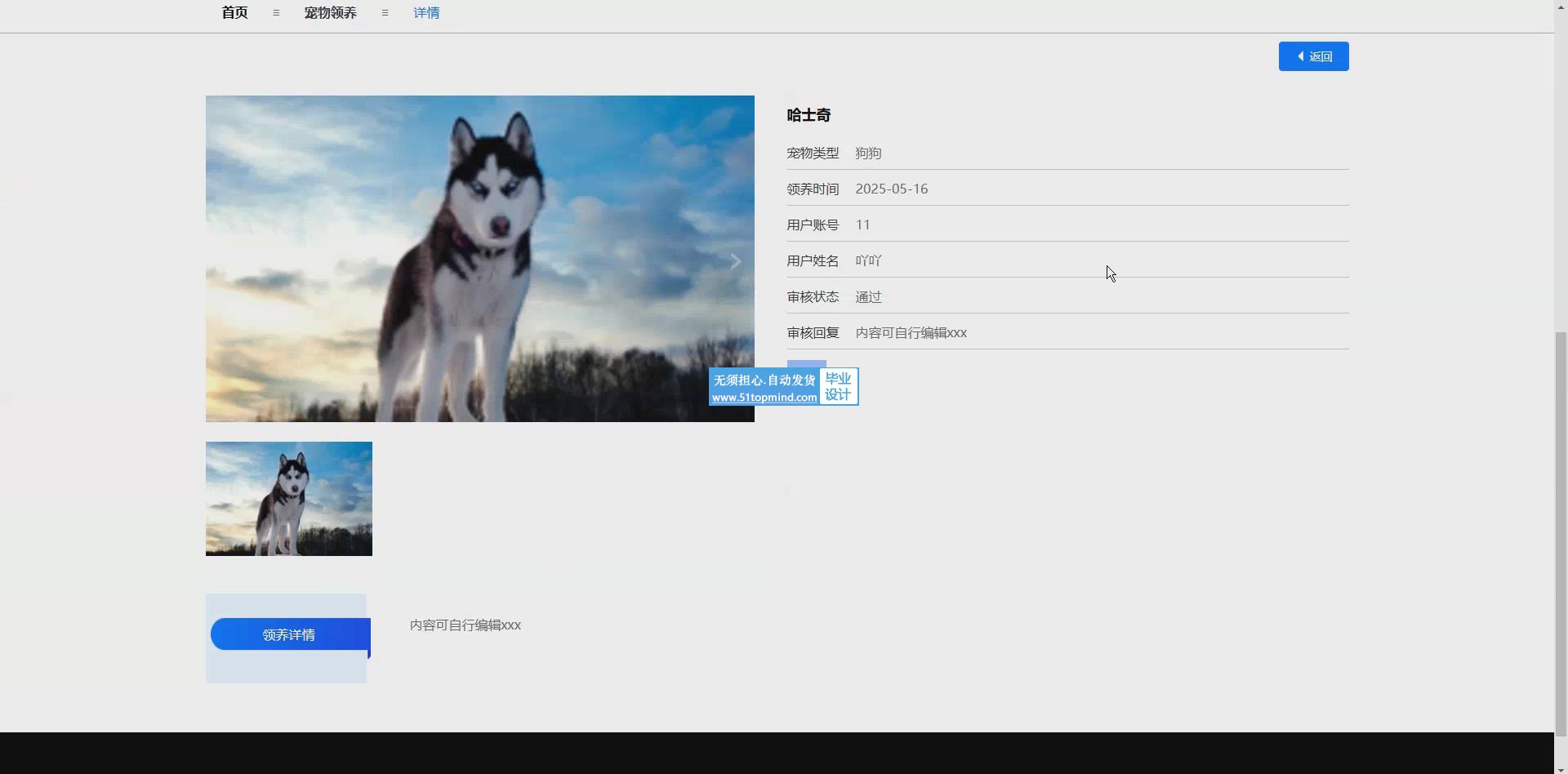 作为平台核心功能之一的是流浪宠物信息发布与管理模块,管理员可借助此模块发布宠物的基本资料、健康情形、领养需求等,方便潜在的领养者去查看,领养申请与审核模块准许用户查看可领养宠物继而提交申请,管理员审核申请内容后判定是否批准领养,保障领养过程既安全又合规。宠物健康管理模块辅助管理员把宠物健康信息记录好,保证领养者拿到全面的健康记录,本研究采用现代的Web开发技术手段,后端采用Spring Boot这个框架,前端利用Vue.js框架实现动态页面跟用户的交互,采用MySQL数据库存储数据。系统设计追随MVC架构模式,让系统结构清晰易懂,功能模块彼此间耦合程度低,利于做系统维护与扩展,研究也将留意平台的用户体验及系统性能优化,保障平台在流量上升时依旧稳定运行,并经由合理设计改善用户的使用体验感,本研究的内容不光囊括了系统设计与实现的多个范畴,还顾及到了技术挑选、系统优化以及用户体验等事项,试图为流浪宠物领养找到一个高效又便捷的解决方案。