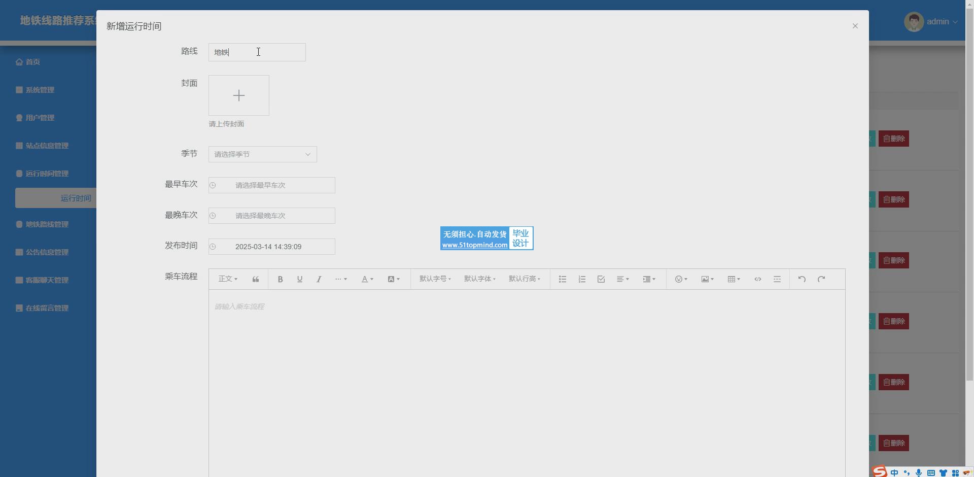 该系统为用户提供运行时间查询、站点信息查看、地铁路线获取以及客服聊天等功能,满足用户日常出行信息需求与问题咨询。同时,为管理员提供用户管理、站点信息管理、运行时间管理、地铁路线管理以及客服聊天管理等功能,便于对系统数据及用户互动进行维护与优化,确保系统高效稳定运行,提升用户体验与管理效率。随着城市化进程加快,地铁成为重要交通方式。传统地铁信息查询依赖纸质地图或人工咨询,存在信息更新滞后、查询效率低、无法个性化推荐等问题。本地铁线路推荐系统采用 Vue 构建前端,实现交互界面;后端基于 Spring Boot 框架,处理业务逻辑;数据存储使用 MySQL 数据库。系统功能涵盖用户端的运行时间查询、站点信息查看、地铁路线规划和客服聊天,以及管理员端的用户管理、站点信息管理、运行时间管理、地铁路线管理和客服聊天管理。