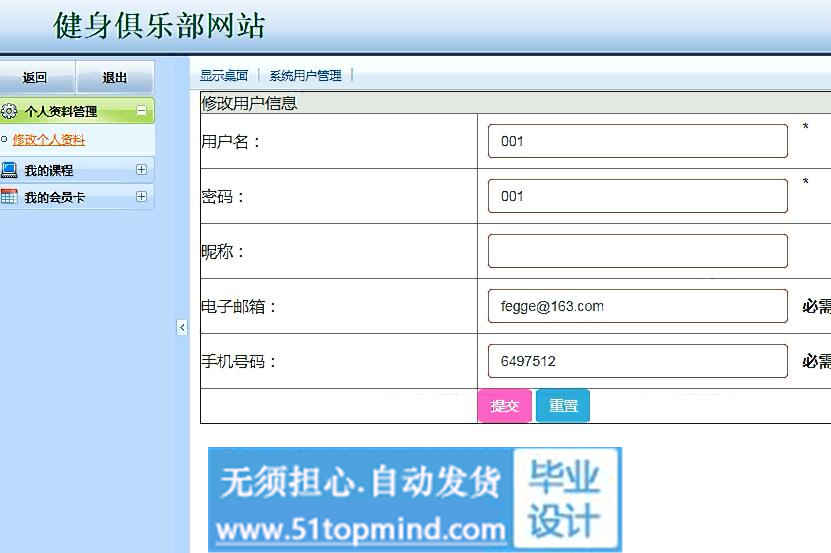用户模块可以对个人资料进行管理,修改用户名、密码等个人信息;可以进行课程安排管理、添加办卡、添加选课等操作。