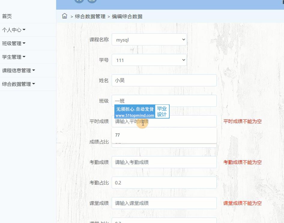 通过对高校学生综合测评管理内容的学习研究,进而设计并实现一个高校学生综合测评管理系统。系统实现的主要功能包括个人中心、班级管理、学生管理、课程信息管理、综合数据管理等功能的操作。还有可以正确的为用户服务,准确显示当前信息。