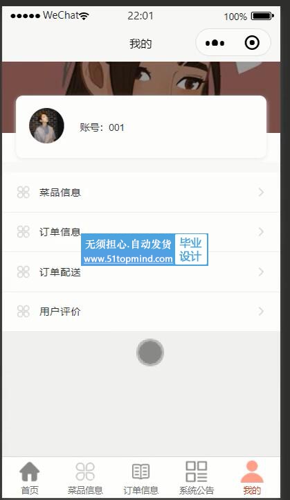 基于小程序-网上订餐的设计基于现有的手机,可以实现首页、个人中心、会员管理,菜品分类管理、菜品信息管理、订单信息管理、订单配送管理、用户评价管理、系统公告管理、系统管理,等功能。方便会员对菜品信息、订单信息、系统公告、我的等详细的了解及统计分析