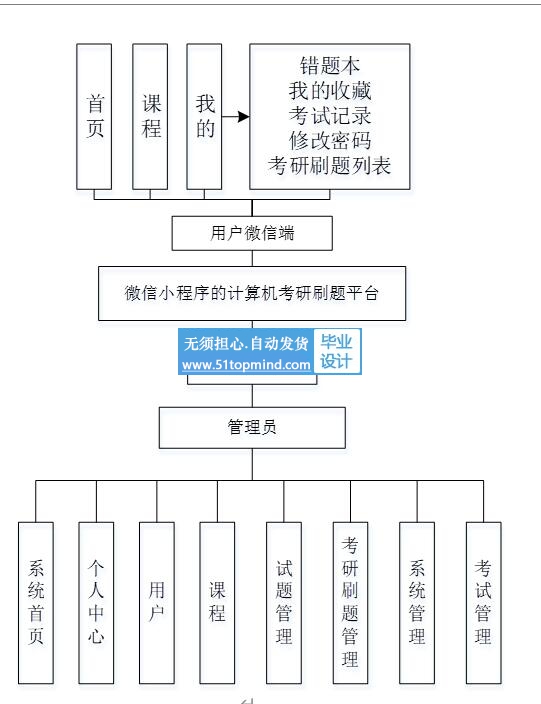微信小程序的计算机考研刷题平台主要分为二种用户操作:用户微信端:可以浏览页面发布的课程,也可注册成为用户;管理员服务端:管理员服务端的登录、修改密码等功能;管理员可以对用户、课程、试题、考研刷题、考试等进行管理[8]。
